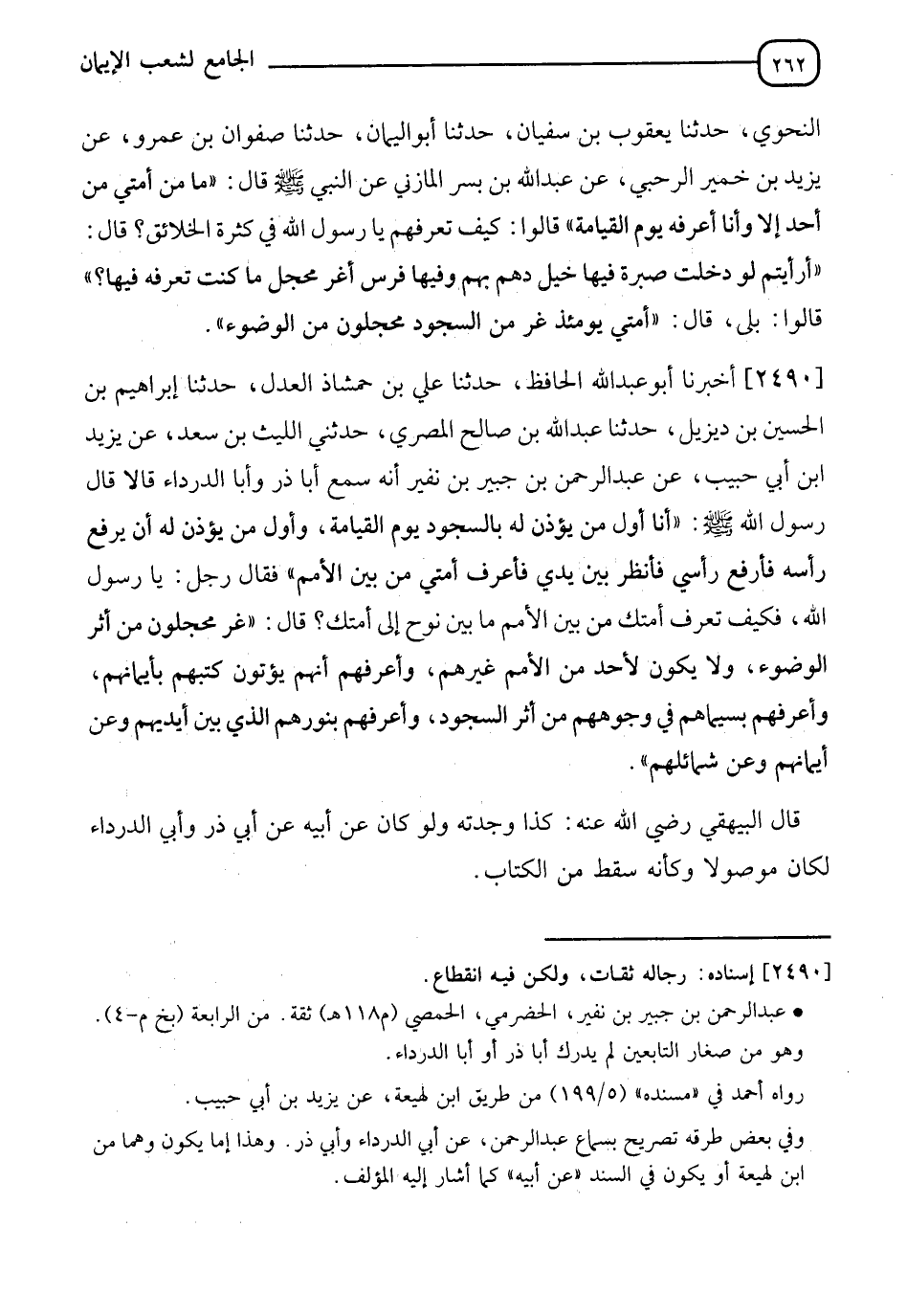 2490 - أَخْبَرَنَا أَبُو عَبْدِ اللهِ الْحَافِظُ، حَدَّثَنَا عَلِيُّ بْنُ حَمْشَاذَ الْعَدْلُ، حَدَّثَنَا إِبْرَاهِيمُ بْنُ الْحُسَيْنِ بْنِ دِيزِيلَ، حَدَّثَنَا عَبْدُ اللهِ بْنُ صَالِحٍ الْمِصْرِيُّ، حَدَّثَنِي اللَّيْثُ بْنُ سَعْدٍ، عَنْ يَزِيدَ بْنِ أَبِي حَبِيبٍ، عَنْ عَبْدِ الرَّحْمَنِ بْنِ جُبَيْرِ بْنِ نُفَيْرٍ، أَنَّهُ سَمِعَ أَبَا ذَرٍّ، وَأَبَا الدَّرْدَاءِ، قَالَا: قَالَ رَسُولُ اللهِ صَلَّى اللَّهُ عَلَيْهِ وَسَلَّمَ: " أَنَا أَوَّلُ مَنْ يُؤْذَنُ لَهُ بِالسُّجُودِ يَوْمَ الْقِيَامَةِ وَأَوَّلُ مَنْ يُؤْذَنُ لَهُ أَنْ يَرْفَعَ رَأْسَهُ، فَأَرْفَعُ رَأْسِي فَأُنْظِرُ بَيْنَ يَدَيَّ، فَأَعْرِفُ أُمَّتِي مِنْ بَيْنِ الْأُمَمِ "، فَقَالَ رَجُلٌ: يَا رَسُولَ اللهِ فَكَيْفَ تَعْرِفُ أُمَّتَكَ مِنْ بَيْنِ الْأُمَمِ؟ مَا بَيْنَ نُوحٍ إِلَى أُمَّتِكَ؟ قَالَ: §" غُرٌّ مُحَجَّلُونَ مِنْ أَثَرِ الْوُضُوءِ ولَا يَكُونُ لِأَحَدٍ مِنَ الْأُمَمِ غَيْرِهِمْ، وَأَعْرِفُهُمْ أَنَّهُمْ يُؤْتَوْنَ كُتُبَهُمْ بِأَيْمَانِهِمْ، وَأَعْرِفُهُمْ بِسِيمَاهُمْ فِي وُجُوهِهِمْ مِنْ أَثَرِ السُّجُودِ، وَأَعْرِفُهُمْ بِنُورِهِمُ الَّذِي بَيْنَ أَيْدِيهِمْ، وَعَنْ أَيْمَانِهِمْ، وَعَنْ شَمَائِلِهِمْ " قَالَ الْبَيْهَقِيُّ رَضِيَ اللهُ عَنْهُ: " كَذَا وَجَدْتُهُ وَلَوْ كَانَ، عَنْ أَبِيهِ، عَنْ أَبِي ذَرٍّ، وَأَبِي الدَّرْدَاءِ، لَكَانَ مَوْصُولًا وَكَأَنَّهُ سَقَطَ مِنَ الْكِتَابِ "
