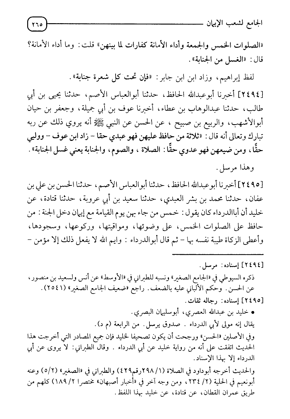 2495 - أَخْبَرَنَا أَبُو عَبْدِ اللهِ الْحَافِظُ، حَدَّثَنَا أَبُو الْعَبَّاسِ الْأَصَمُّ، حَدَّثَنَا الْحَسَنُ بْنُ عَلِيِّ بْنِ عَفَّانَ، حَدَّثَنَا مُحَمَّدُ بْنُ بِشْرٍ الْعَبْدِيُّ، حَدَّثَنَا سَعِيدُ بْنُ أَبِي عَرُوبَةَ، حَدَّثَنَا قَتَادَةُ، عَنِ خليد، أَنَّ أَبَا الدَّرْدَاءِ، كَانَ يَقُولُ: §" خَمْسٌ مَنْ جَاءَ بِهِنَّ يَوْمَ الْقِيَامَةِ مَعَ إِيمَانٍ دَخَلَ الْجَنَّةَ، مَنْ حَافَظَ عَلَى الصَّلَوَاتِ الْخَمْسِ، عَلَى وُضُوئِهَا، وَمَوَاقِيتِهَا، وَرُكُوعِهَا، وَسُجُودِهَا، وَأَعْطَى الزَّكَاةَ طَّيِّبَةً نَفْسُهُ بِهَا "، ثُمَّ قَالَ أَبُو الدَّرْدَاءِ: " وَأَيْمُ اللهِ لَا يَفْعَلُ ذَلِكَ إِلَّا مُؤْمِنٌ، -[266]- وَصِيَامُ رَمَضَانَ، وَحَجُّ الْبَيْتِ إِن اسْتَطَاعَ إِلَيْهِ سَبِيلًا، وَأَدَى الْأَمَانَةِ "، قَالُوا: وَمَا أَدَاءُ الْأَمَانَةِ يَا أَبَا الدَّرْدَاءِ، قَالَ: " اغْتِسَالٌ مِنَ الْجَنَابَةِ فَإِنَّ اللهَ لَمْ يَأْمَنِ ابْنَ آدَمَ عَلَى شَيْءٍ مِنْ دِينِهِ غَيْرِهَا "