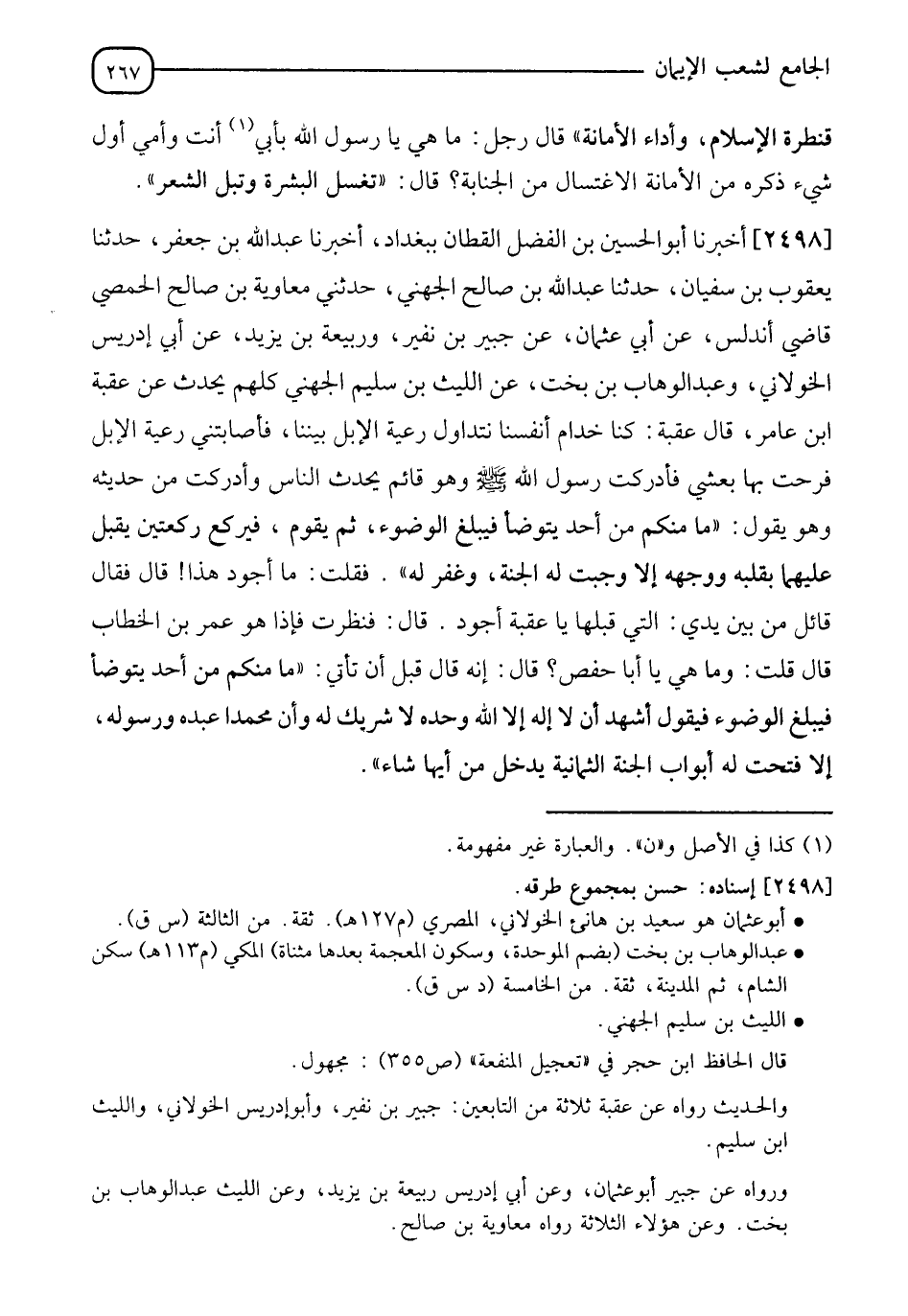 2498 - أَخْبَرَنَا أَبُو الْحُسَيْنِ بْنُ الْفَضْلِ الْقَطَّانُ، بِبَغْدَادَ، أَخْبَرَنا عَبْدُ اللهِ بْنُ جَعْفَرٍ، حَدَّثَنَا يَعْقُوبُ بْنُ سُفْيَانَ، حَدَّثَنَا عَبْدُ اللهِ بْنُ صَالِحٍ الْجُهَنِيُّ، حَدَّثَنِي مُعَاوِيَةُ بْنُ صَالِحٍ الْحِمْصِيُّ، قَاضي أَنْدَلُس، عَنْ أَبِي عُثْمَانَ، عَنْ جُبَيْرِ بْنِ نُفَيْرٍ، وَرَبِيعَةَ بْنِ يَزِيدَ، عَنْ أَبِي إِدْرِيسَ الْخَوْلَانِيِّ، وَعَبْدِ الْوَهَّابِ بْنِ بُخْتٍ، عَنِ اللَّيْثِ بْنِ سُلَيْمٍ الْجُهَنِيِّ، كُلُّهُمْ يُحَدِّثُ، عَنْ عُقْبَةَ بْنِ عَامِرٍ، قَالَ عُقْبَةُ: كُنَّا خُدَّامَ أَنْفُسِنَا نَتَدَاوَلُ رَعِيَّةَ الْإِبِلِ بَيْنَنَا فَأَصَابَتْنِي رَعِيَّةُ الْإِبِلِ، فَرُحْتُ بِهَا بِعَشِيٍّ، فَأَدْرَكْتُ رَسُولَ اللهِ صَلَّى اللَّهُ عَلَيْهِ وَسَلَّمَ وَهُوَ قَائِمٌ يُحَدِّثُ النَّاسَ، وَأَدْرَكْتُ مِنْ حَدِيثِهِ، وَهُوَ يَقُولُ: " مَا مِنْكُمْ مِنْ أَحَدٍ يَتَوَضَّأُ، فَيَبْلُغُ الْوُضُوءَ، ثُمَّ يَقُومُ فَيَرْكَعُ رَكْعَتَيْنِ يُقْبِلُ عَلَيْهِمَا بِقَلْبِهِ وَوَجْهِهِ إِلَّا وَجَبَتْ لَهُ الْجَنَّةُ وَغُفِرَ لَهُ "، فَقُلْتُ: مَا أَجْوَدَ هَذَا؟ قال فَقَالَ قَائِلٌ: مِنْ بَيْنِ يَدَيِ الَّتِي قَبْلَهَا يَا عُقْبَةُ أَجْوَدُ، قَالَ: فَنَظَرْتُ فَإِذَا هُوَ عُمَرُ بْنُ الْخَطَّابِ، قَالَ: قُلْتُ: وَمَا هِيَ يَا أَبَا حَفْصٍ؟ قَالَ: إِنَّهُ قَالَ قَبْلَ أَنْ تَأْتِي: " §مَا مِنْكُمْ من أَحَدٌ يَتَوَضَّأُ فَيَبْلُغُ الْوُضُوءَ فَيَقُولُ: أَشْهَدُ أَنْ لَا إِلَهَ إِلَّا اللهُ وَحْدَهُ لَا شَرِيكَ لَهُ وَأَنَّ مُحَمَّدًا عَبْدُهُ وَرَسُولُهُ، إِلَّا فُتِحَتْ لَهُ أَبْوَابُ الْجَنَّةِ الثَّمَانِيَةُ يَدْخُلُ مِنْ أَيِّهَا شَاءَ " -[268]- أَخْرَجَهُ مُسْلِمٌ مِنْ حَدِيثِ عَبْدِ الرَّحْمَنِ بْنِ مَهْدِيٍّ، عَنْ مُعَاوِيَةَ بْنِ صَالِحٍ، غَيْرَ أَنَّهُ لَمْ يَذْكُرْ رِوَايَةَ عَبْدِ الْوَهَّابِ بْنِ بُخْتٍ