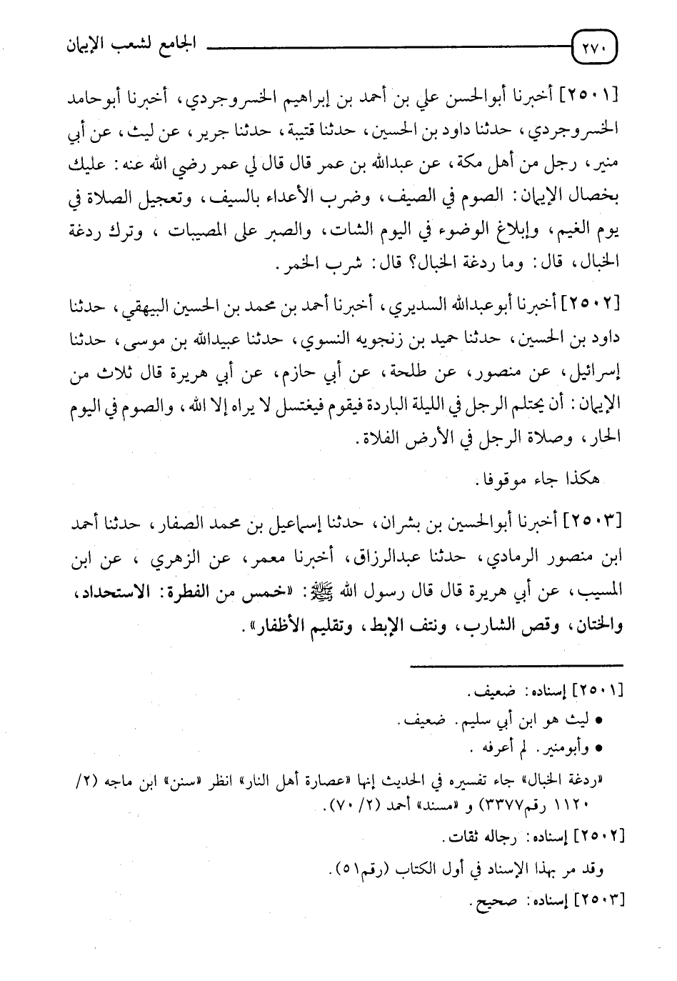 2501 - أَخْبَرَنَا أَبُو الْحَسَنِ عَلِيُّ بْنُ أَحْمَدَ بْنِ إِبْرَاهِيمَ الْخُسْرَوْجِرْدِيُّ، أَخْبَرَنا أَبُو حَامِدٍ الْخُسْرَوْجِرْدِيُّ، حَدَّثَنَا دَاوُدُ بْنُ الْحُسَيْنِ، حَدَّثَنَا قُتَيْبَةُ، حَدَّثَنَا جَرِيرٌ، عَنْ لَيْثٍ، عَنْ أَبِي مُنِيرٍ، رَجُلٍ مِنْ أَهْلِ مَكَّةَ، عَنْ عَبْدِ اللهِ بْنِ عُمَرَ، قَالَ قال لِي عُمَرُ رَضِيَ اللهُ عَنْهُ: " عَلَيْكَ §بِخِصَالِ الْإِيمَانِ: الصَّوْمُ فِي الصَّيْفِ، وَضَرْبُ الْأَعْدَاءِ بِالسَّيْفِ، وَتَعْجِيلُ الصَّلَاةِ فِي يَوْمِ الْغَيْمِ، وَإِبْلَاغُ الْوُضُوءِ فِي الْيَوْمِ الشَّاتِ، وَالصَّبْرُ عَلَى الْمُصِيبَاتِ، وَتَرَكُ رَدْغَةِ الْخَبَالِ "، قَالَ: وَمَا رَدْغَةِ الْخَبَالِ قَالَ: " شُرْبُ الْخَمْرِ "