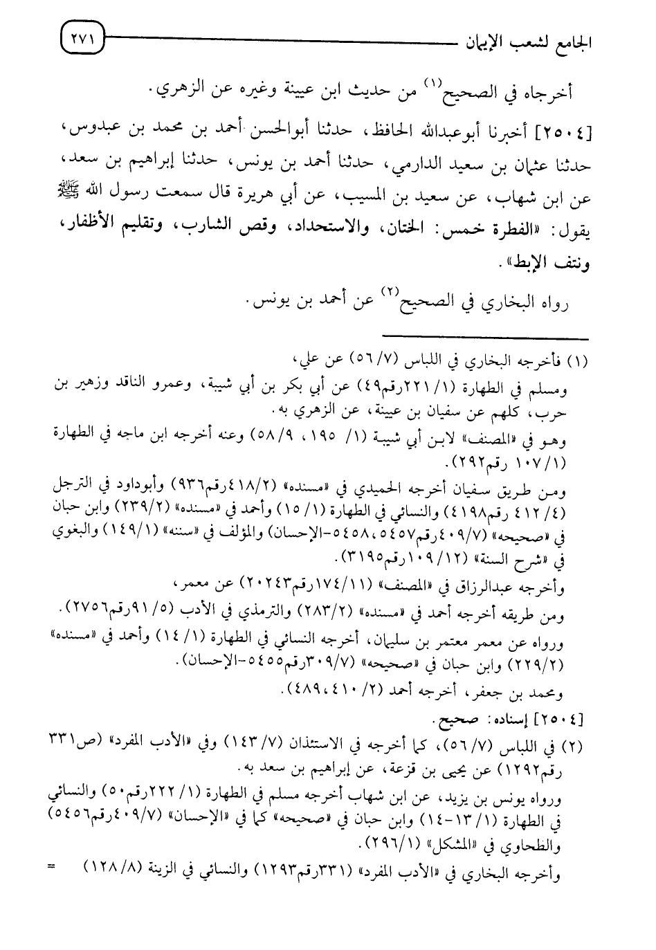 2504 - أَخْبَرَنَا أَبُو عَبْدِ اللهِ الْحَافِظُ، حَدَّثَنَا أَبُو الْحَسَنِ أَحْمَدُ بْنُ مُحَمَّدِ بْنِ عَبْدُوسٍ، حَدَّثَنَا عُثْمَانُ بْنُ سَعِيدٍ الدَّارِمِيُّ، حَدَّثَنَا أَحْمَدُ بْنُ يُونُسَ، حَدَّثَنَا إِبْرَاهِيمُ بْنُ سَعْدٍ، عَنِ ابْنِ شِهَابٍ، عَنْ سَعِيدِ بْنِ الْمُسَيِّبِ، عَنْ أَبِي هُرَيْرَةَ، قَالَ: سَمِعْتُ رَسُولَ اللهِ صَلَّى اللَّهُ عَلَيْهِ وَسَلَّمَ يَقُولُ: " §الْفِطْرَةُ خَمْسٌ: الْخِتَانُ، وَالِاسْتِحْدَادُ، وَقَصُّ الشَّارِبِ، وَتَقْلِيمُ الْأَظْفَارِ، وَنَتْفُ الْإِبْطِ " رَوَاهُ الْبُخَارِيُّ فِي الصَّحِيحِ عَنْ أَحْمَدَ بْنِ يُونُسَ