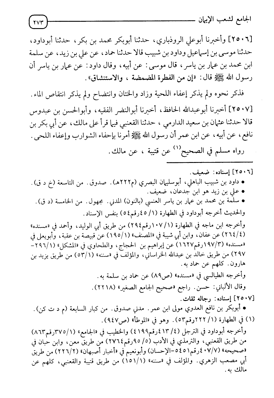 2507 - أَخْبَرَنَا أَبُو عَبْدِ اللهِ الْحَافِظُ، أَخْبَرَنا أَبُو النَضْرٍ الْفَقِيهُ، وَأَبُو الْحَسَنِ بْنُ عَبْدُوسٍ، قَالَا: حَدَّثَنَا عُثْمَانُ بْنُ سَعِيدٍ الدَّارِمِيُّ، حَدَّثَنَا الْقَعْنَبِيُّ، فِيمَا قَرَأَ عَلَى مَالِكٍ، عَنْ أَبِي بَكْرِ بْنِ نَافِعٍ، عَنْ أَبِيهِ، عَنِ ابْنِ عُمَرَ، " أَنَّ رَسُولَ اللهِ صَلَّى اللَّهُ عَلَيْهِ وَسَلَّمَ §أَمَرَنَا بِإِحْفاءِ الشَّوَارِبِ، وَإِعْفَاءِ اللِّحَى " رَوَاهُ مُسْلِمٌ فِي الصَّحِيحِ، عَنْ قُتَيْبَةَ، عَنْ مَالِكٍ