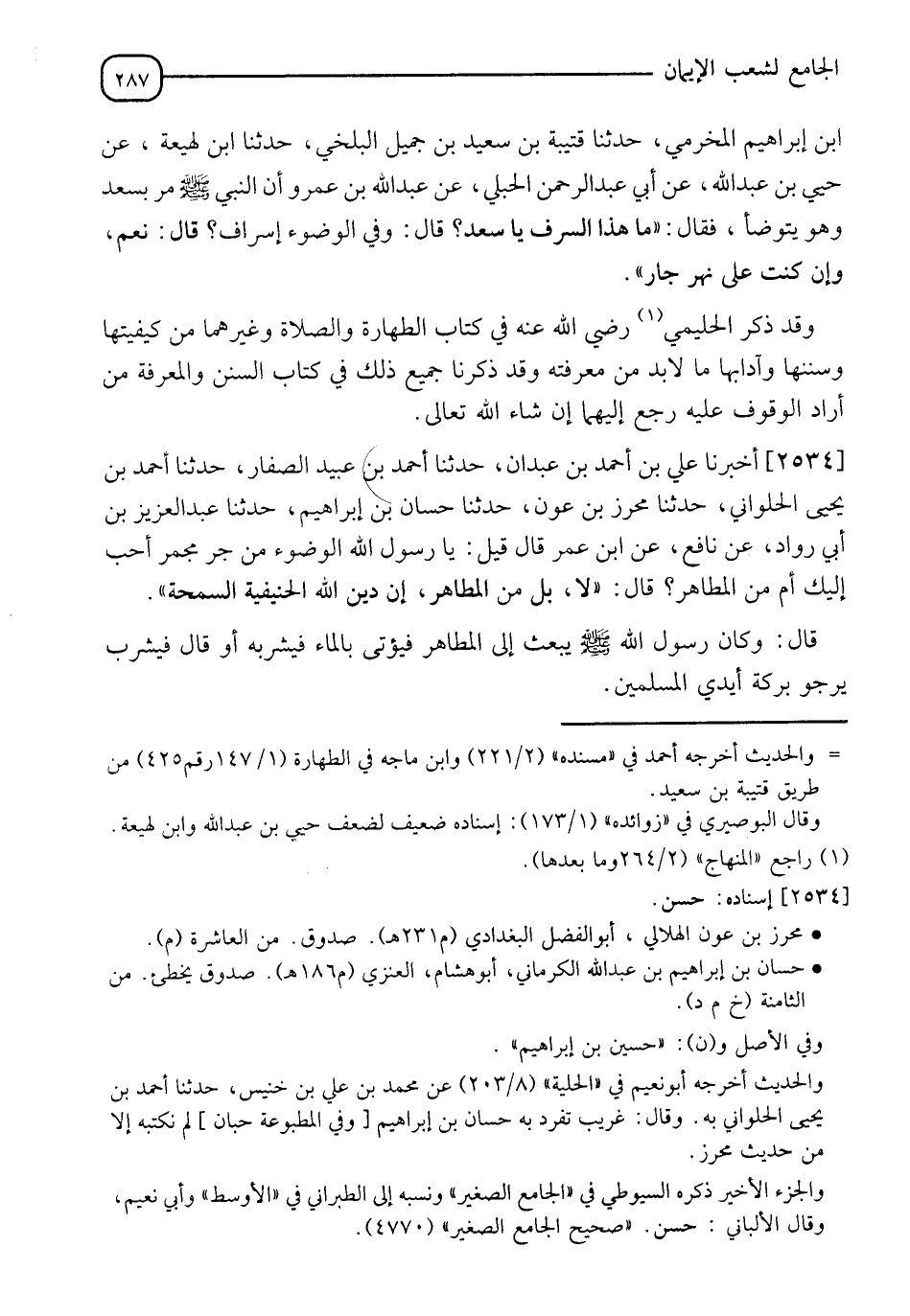 2534 - أَخْبَرَنَا عَلِيُّ بْنُ أَحْمَدَ بْنِ عَبْدَانَ، حدثنا أَحْمَدُ بْنُ عُبَيْدٍ الصَّفَّارُ، حدثنا أَحْمَدُ بْنُ يَحْيَى الْحُلْوَانِيُّ، حدثنا مُحْرِزُ بْنُ عَوْنٍ، حدثنا حَسَّانُ بْنُ إِبْرَاهِيمَ، حدثنا عَبْدُ الْعَزِيزِ بْنُ أَبِي رَوَّادَ، عَنْ نَافِعٍ، عَنِ ابْنِ عُمَرَ، قَالَ: قِيلَ يَا رَسُولَ اللهِ §الْوُضُوءُ مِنْ جَرٍّ مُجَمَّرٍ أَحَبُّ إِلَيْكَ أَمْ مِنَ الْمَطَاهِرِ؟ قَالَ: " لَا بَلْ مِنَ الْمَطَاهِرِ إِنَّ دِينَ اللهِ الْحَنِيفِيَّةُ السَّمْحَةُ "، قَالَ: وَكَانَ رَسُولُ اللهِ صَلَّى اللَّهُ عَلَيْهِ وَسَلَّمَ: يَبْعَثُ إِلَى الْمَطَاهِرِ فَيُؤْتَى بِالْمَاءِ فَيَشْرَبُهُ أَوْ قَالَ: فَيَشْرَبُ يَرْجُو بَرَكَةَ أَيْدِي الْمُسْلِمِينَ