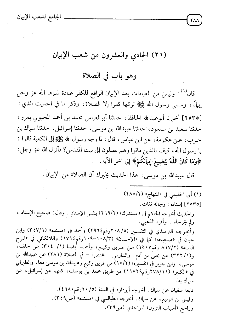§الْحَادِي وَالْعِشْرُونَ مِنْ شُعَبِ الْإِيمَانِ وَهُوَ بَابٌ فِي الصَّلَاة " قَالَ: وَلَيْسَ مِنَ الْعِبَادَاتِ بَعْدَ الْإِيمَانِ الرَّافِعِ للْكُفْرِ عِبَادَةٌ سَمَّاهَا اللهُ عَزَّ وَجَلَّ إِيمَانًا، وَسَمَّى رَسُولُ اللهِ صَلَّى اللَّهُ عَلَيْهِ وَسَلَّمَ تَرْكَهَا كُفْرًا إِلَّا الصَّلَاةُ وَذَكَرَ مَا فِي الْحَدِيثِ الَّذِي "