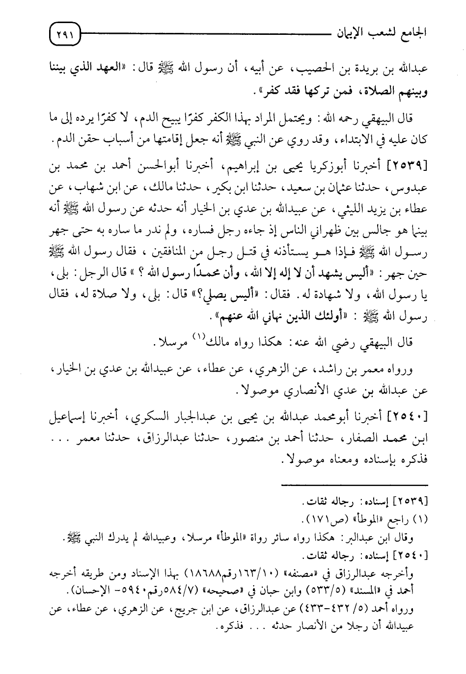2539 - أَخْبَرَنَا أَبُو زَكَرِيَّا يَحْيَى بْنُ إِبْرَاهِيمَ، أَخْبَرَنا أَبُو الْحَسَنِ أَحْمَدُ بْنُ مُحَمَّدِ بْنِ عَبْدُوسٍ، حدثنا عُثْمَانُ بْنُ سَعِيدٍ، حدثنا ابْنِ بُكَيْرٍ، حدثنا مَالِكٌ، عَنِ ابْنِ شِهَابٍ، عَنْ عَطَاءِ بْنِ يَزِيدَ اللَّيْثِيِّ، عَنْ عُبَيْدِ اللهِ بْنِ عَدِيِّ بْنِ الْخِيَارِ، أَنَّهُ حَدَّثَهُ عَنْ رَسُولِ اللهِ صَلَّى اللَّهُ عَلَيْهِ وَسَلَّمَ، أَنَّهُ بَيْنَمَا هُوَ جَالِسٌ بَيْنَ ظَهْرَانَيِ النَّاسِ، إِذْ جَاءَهُ رَجُلٌ فَسَارَّهُ، وَلَمْ نَدْرِ مَا سَارَّهُ بِهِ، حَتَّى جَهْرَ رَسُولُ اللهِ صَلَّى اللَّهُ عَلَيْهِ وَسَلَّمَ، فَإِذَا هُوَ يَسْتَأْذِنُهُ فِي قَتْلِ رَجُلٍ مِنَ الْمُنَافِقِينَ، فَقَالَ رَسُولُ اللهِ صَلَّى اللَّهُ عَلَيْهِ وَسَلَّمَ حِينَ جَهْرَ:§" أَلَيْسَ يَشْهَدُ أَنْ لَا إِلَهَ إِلَّا اللهُ وَأَنَّ مُحَمَّدًا رَسُولُ اللهِ" قَالَ الرَّجُلُ: بَلَى يَا رَسُولَ اللهِ، وَلَا شَهَادَةَ لَهُ، فَقَالَ:" أَلَيْسَ يُصَلِّي؟ "، قَالَ: بَلَى، وَلَا صَلَاةَ لَهُ، فَقَالَ رَسُولُ اللهِ صَلَّى اللَّهُ عَلَيْهِ وَسَلَّمَ:" أُولَئِكَ الَّذِينَ نَهَانِي اللهُ عَنْهُمْ" قَالَ الْبَيْهَقِيُّ رَضِيَ اللهُ عَنْهُ: هَكَذَا رَوَاهُ مالك مُرْسَلًا، وَرَوَاهُ مَعْمَرُ بْنُ رَاشِدٍ، عَنِ الزُّهْرِيِّ، عَنْ عَطَاءٍ، عَنْ عُبَيْدِ اللهِ بْنِ عَدِيِّ بْنِ الْخِيَارِ، عَنْ عَبْدِ اللهِ بْنِ عَدِيٍّ الْأَنْصَارِيِّ، مَوْصُولًا