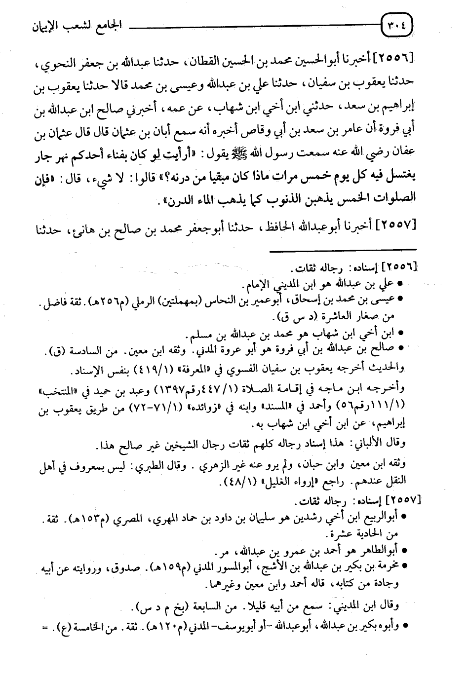 2556 - أَخْبَرَنَا أَبُو الْحُسَيْنِ مُحَمَّدُ بْنُ الْحُسَيْنِ الْقَطَّانُ، حَدَّثَنَا عَبْدُ اللهِ بْنُ جَعْفَرٍ النَّحْوِيُّ، حَدَّثَنَا يَعْقُوبُ بْنُ سُفْيَانَ، حَدَّثَنَا عَلِيُّ بْنُ عَبْدِ اللهِ، وَعِيسَى بْنُ مُحَمَّدٍ، قَالَا: حَدَّثَنَا يَعْقُوبُ بْنُ إِبْرَاهِيمَ بْنِ سَعْدٍ، حَدَّثَنِي ابْنُ أَخِي ابْنِ شِهَابٍ، عَنْ عَمِّهِ، أَخْبَرَنِي صَالِحُ بْنُ عَبْدِ اللهِ بْنِ أَبِي فَرْوَةَ، أَنَّ عَامِرَ بْنَ سَعْدِ بْنِ أَبِي وَقَّاصٍ، أَخْبَرَهُ أَنَّهُ، سَمِعَ أَبَانَ بْنَ عُثْمَانَ، قَالَ: قَالَ عُثْمَانُ بْنُ عَفَّانَ رَضِيَ اللهُ عَنْهُ: سَمِعْتُ رَسُولَ اللهِ صَلَّى اللَّهُ عَلَيْهِ وَسَلَّمَ يَقُولُ: §" أَرَأَيْتَ لَوْ كَانَ بِفِنَاءِ أَحَدِكُمْ نَهَرٌ جَارٍ يَغْتَسِلُ فِيْه كُلَّ يَوْمٍ خَمْسَ مَرَّاتٍ مَاذَا كَانَ مُبْقِيًا مِنْ دَرَنِهِ؟ " قَالُوا: لَا شَيءَ قَالَ: " فَإِنَّ الصَّلَوَاتِ الْخَمْسَ يُذْهِبْنَ الذُّنُوبَ كَمَا يُذْهِبُ الْمَاءُ الدَّرَنَ "