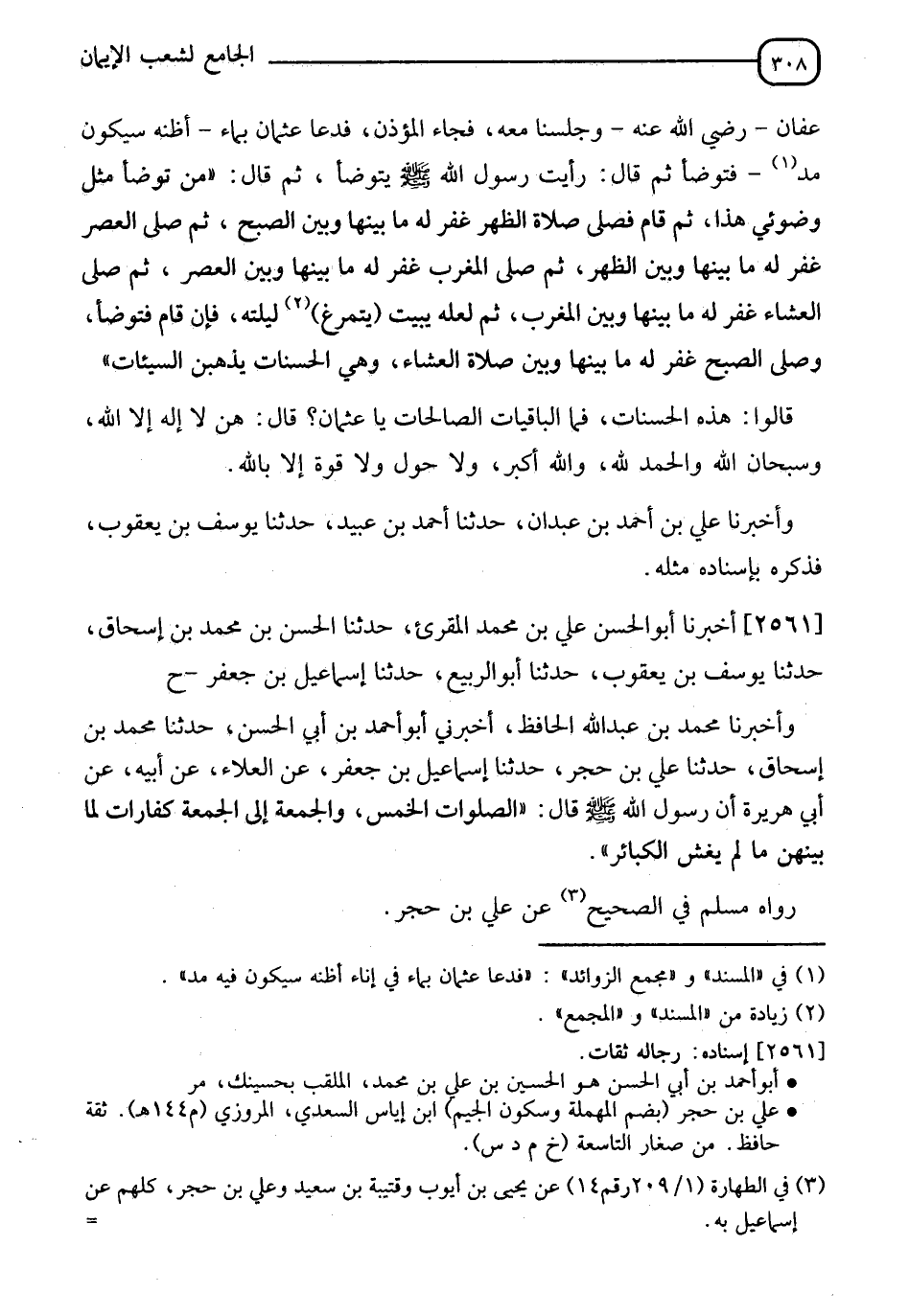 2561 - أَخْبَرَنَا أَبُو الْحَسَنِ عَلِيُّ بْنُ مُحَمَّدٍ الْمُقْرِئُ، حَدَّثَنَا الْحَسَنُ بْنُ مُحَمَّدِ بْنِ إِسْحَاقَ، حَدَّثَنَا يُوسُفُ بْنُ يَعْقُوبَ، حَدَّثَنَا أَبُو الرَّبِيعِ، حَدَّثَنَا إِسْمَاعِيلُ بْنُ جَعْفَرٍ، ح وَأَخْبَرَنَا مُحَمَّدُ بْنُ عَبْدِ اللهِ الْحَافِظُ، أَخْبَرَنِي أبو أَحْمَدُ بْنُ أَبِي الْحَسَنِ، حَدَّثَنَا مُحَمَّدُ بْنُ إِسْحَاقَ، حَدَّثَنَا عَلِيُّ بْنُ حَجَرٍ، حَدَّثَنَا إِسْمَاعِيلُ بْنُ جَعْفَرٍ، عَنِ الْعَلَاءِ، عَنْ أَبِيهِ، عَنْ أَبِي هُرَيْرَةَ، أَنَّ رَسُولَ اللهِ صَلَّى اللَّهُ عَلَيْهِ وَسَلَّمَ قَالَ: §" الصَّلَوَاتُ الْخَمْسُ وَالْجُمُعَةُ إِلَى الْجُمُعَةِ كَفَّارَاتٌ لِمَا بَيْنَهُنَّ مَا لَمْ يغْشَ الْكَبَائِرُ " رَوَاهُ مُسْلِمٌ فِي الصَّحِيحِ، عَنْ عَلِيِّ بْنِ حَجَرٍ