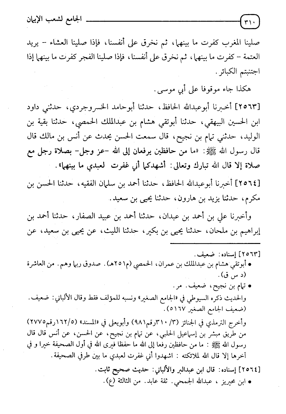 2563 - أَخْبَرَنَا أَبُو عَبْدِ اللهِ الْحَافِظُ، حَدَّثَنَا أَبُو حَامِدٍ الْخُسْرَوْجِرْدِيُّ، حَدَّثَنِي دَاوُدُ بْنُ الْحُسَيْنِ الْبَيْهَقِيُّ، حَدَّثَنَا أَبُو تَقِيٍّ هِشَامُ بْنُ عَبْدِ الْمَلِكِ الْحِمْصِيُّ، حَدَّثَنَا بَقِيَّةُ بْنُ الْوَلِيدِ، حَدَّثَنِي تمَّامُ بْنُ نَجِيحٍ، قَالَ: سَمِعْتُ الْحَسَنَ، يُحَدِّثُ عَنْ أَنَسِ بْنِ مَالِكٍ، قَالَ: قَالَ رَسُولُ اللهِ صَلَّى اللَّهُ عَلَيْهِ وَسَلَّمَ: " مَا مِنْ حَافِظَيْنِ يَرْفَعَانِ إِلَى اللهِ عَزَّ وَجَلَّ بِصَلَاةٍ رَجُلٍ مَعَ صَلَاةٍ إِلَّا قَالَ اللهُ تَبَارَكَ وَتَعَالَى: §أُشْهِدُكُما أَنِّي غَفَرْتُ لِعَبْدِي مَا بَيْنَهُمَا "