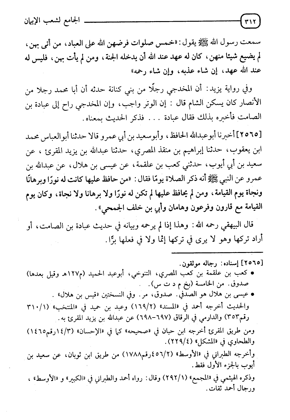 2565 - أَخْبَرَنَا أَبُو عَبْدِ اللهِ الْحَافِظُ، وَأَبُو سَعِيدِ بْنِ أَبِي عَمْرٍو، قَالَا: حَدَّثَنَا أَبُو الْعَبَّاسِ مُحَمَّدُ بْنُ يَعْقُوبَ، حَدَّثَنَا إِبْرَاهِيمُ بْنُ مُنْقِذٍ الْمِصْرِيُّ، حَدَّثَنَا عَبْدُ اللهِ بْنُ يَزِيدَ الْمُقْرِئ، عَنْ سَعِيدِ بْنِ أَبِي أَيُّوبَ، حَدَّثَنِي كَعْبُ بْنُ عَلْقَمَةَ، عَنْ عيسى بْنِ هِلَالٍ، عَنْ عَبْدِ اللهِ بْنِ عَمْرٍو، عَنِ النَّبِيِّ صَلَّى اللَّهُ عَلَيْهِ وَسَلَّمَ، أَنَّهُ ذَكَرَ الصَّلَاةَ يَوْمًا، فَقَالَ:" §مَنْ حَافِظَ عَلَيْهَا كَانَتْ لَهُ نُورًا وَبُرْهَانًا وَنَجَاةً يَوْمَ الْقِيَامَةِ، وَمَنْ لَمْ يُحَافِظْ عَلَيْهَا لَمْ تَكُنْ لَهُ نُورًا، وَلَا بُرْهَانًا، وَلَا نَجَاةً، وَكَانَ يَوْمَ الْقِيَامَةِ مَعَ قَارُونَ، وَفِرْعَوْنَ، وَهَامَانَ، وَأُبَيِّ بْنِ خَلَفٍ الْجُمَحِيِّ" قَالَ الْبَيْهَقِيُّ رحمه اللهُ:" وَهَذَا إِذَا لَمْ يَرْحَمْهُ، وَبَيَانُهُ فِي حَدِيثِ عُبَادَةَ بْنِ الصَّامِتِ، أو أَرَادَ تَرْكَهَا وَهُوَ لَا يَرَى فِي تَرْكِهَا إِثْمًا وَلَا فِي فِعْلِهَا بِرًّا"