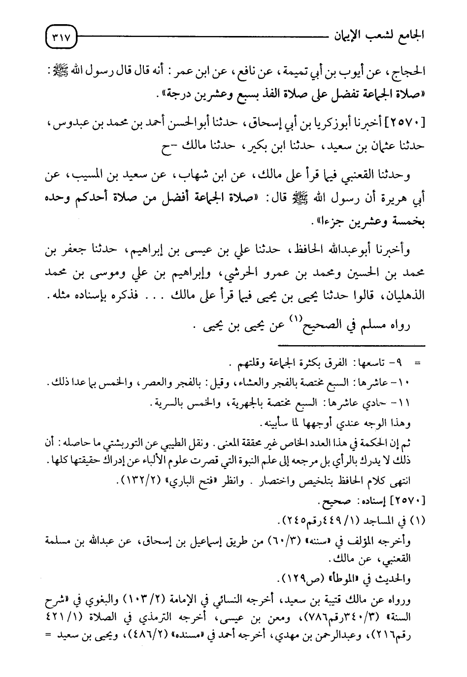 2570 - أَخْبَرَنَا أَبُو زَكَرِيَّا بْنُ أَبِي إِسْحَاقَ، حَدَّثَنَا أَبُو الْحَسَنِ أَحْمَدُ بْنُ مُحَمَّدِ بْنِ عَبْدُوسٍ، حَدَّثَنَا عُثْمَانُ بْنُ سَعِيدٍ، حَدَّثَنَا ابْنُ بُكَيْرٍ، حَدَّثَنَا مَالِكٌ، ح وَحَدَّثَنَا الْقَعْنَبِيُّ، فِيمَا قَرَأَ عَلَى مَالِكٍ، عَنِ ابْنِ شِهَابٍ، عَنْ سَعِيدِ بْنِ الْمُسَيِّبِ، عَنْ أَبِي هُرَيْرَةَ، أَنَّ رَسُولَ اللهِ صَلَّى اللَّهُ عَلَيْهِ وَسَلَّمَ، قَالَ: §" صَلَاةُ الْجَمَاعَةِ أَفْضَلُ مِنْ صَلَاةِ أَحَدِكُمْ وَحْدَهُ بِخَمْسٍ وَعِشْرِينَ جُزْءًا " وَأَخْبَرَنَا أَبُو عَبْدِ اللهِ الْحَافِظُ، حَدَّثَنَا عَلِيُّ بْنُ عِيسَى بْنِ إِبْرَاهِيمَ، حَدَّثَنَا جَعْفَرُ بْنُ مُحَمَّدِ بْنِ الْحُسَيْنِ، وَمُحَمَّدُ بْنُ عَمْرٍو الْحَرَشِيُّ، وَإِبْرَاهِيمُ بْنُ عَلِيٍّ، وَمُوسَى بْنُ مُحَمَّدٍ الذُّهْلِيَّانِ، قَالُوا: حَدَّثَنَا يَحْيَى بْنُ يَحْيَى، فِيمَا قَرَأَ عَلَى مَالِكٍ فَذَكَرَهُ بِإِسْنَادِهِ مِثْلَهُ، رَوَاهُ مُسْلِمٌ فِي الصَّحِيحِ، عَنْ يَحْيَى بْنِ يَحْيَى