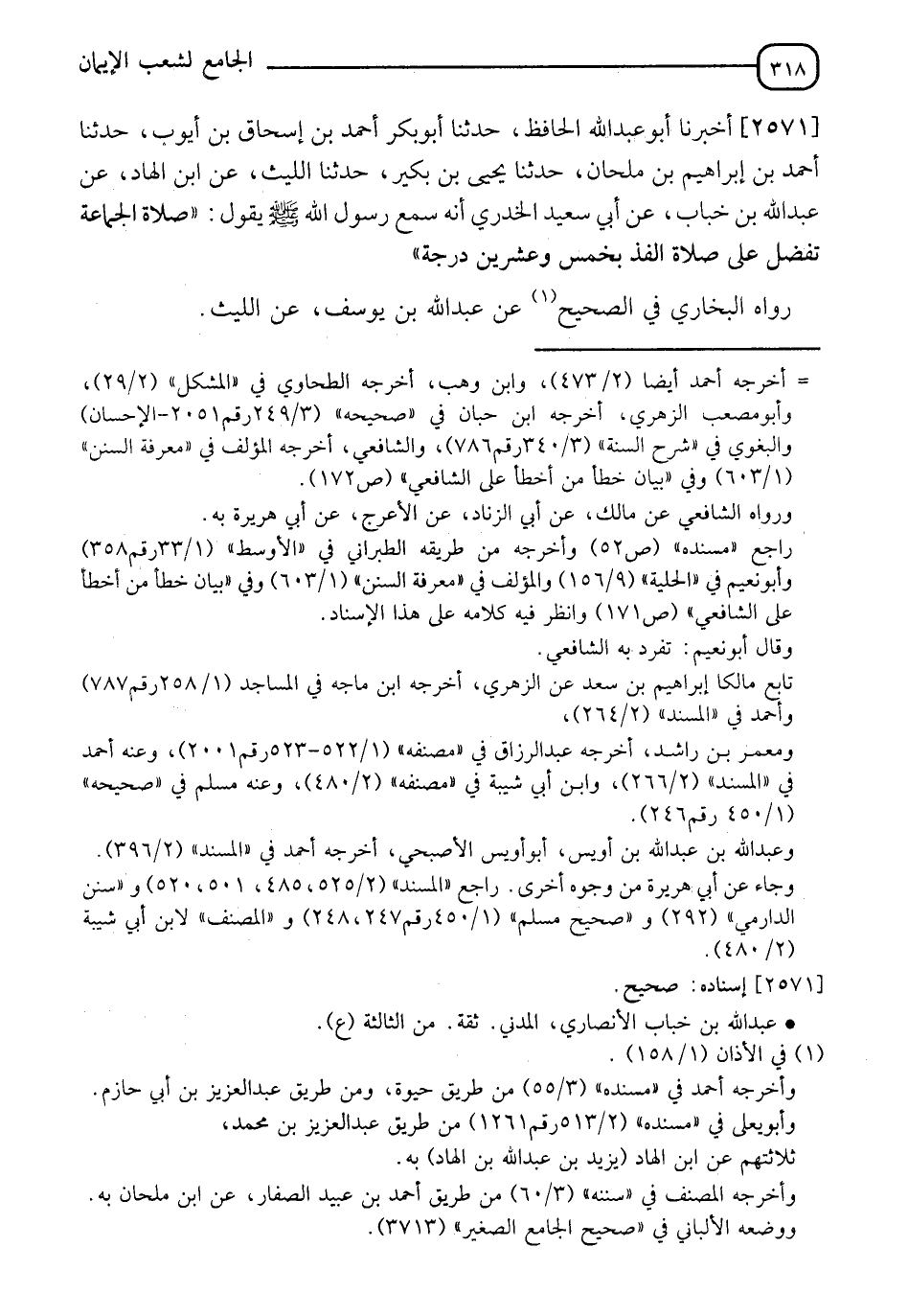 2571 - أَخْبَرَنَا أَبُو عَبْدِ اللهِ الْحَافِظُ، حَدَّثَنَا أَبُو بَكْرٍ أَحْمَدُ بْنُ إِسْحَاقَ بْنِ أَيُّوبَ، حَدَّثَنَا أَحْمَدُ بْنُ إِبْرَاهِيمَ بْنِ مِلْحَانَ، حَدَّثَنَا يَحْيَى بْنُ بُكَيْرٍ، حَدَّثَنَا اللَّيْثُ، عَنِ ابْنِ الْهَادِ، عَنْ عَبْدِ اللهِ بْنِ خَبَّابٍ، عَنْ أَبِي سَعِيدٍ الْخُدْرِيِّ، أَنَّهُ سَمِعَ رَسُولَ اللهِ صَلَّى اللَّهُ عَلَيْهِ وَسَلَّمَ يَقُولُ: §" صَلَاةُ الْجَمَاعَةِ تَفْضُلُ عَلَى صَلَاةِ الْفَذِّ بِخَمْسٍ وَعِشْرِينَ دَرَجَةً " رَوَاهُ الْبُخَارِيُّ فِي الصَّحِيحِ، عَنْ عَبْدِ اللهِ بْنِ يُوسُفَ، عَنِ اللَّيْثِ