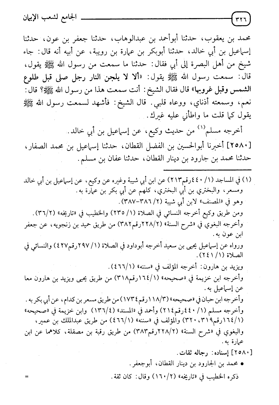 2580 - أَخْبَرَنَا أَبُو الْحُسَيْنِ بْنُ الْفَضْلِ الْقَطَّانُ، حَدَّثَنَا إِسْمَاعِيلُ بْنُ مُحَمَّدٍ الصَّفَّارُ، حَدَّثَنَا مُحَمَّدُ بْنُ جَارُودِ بْنِ دِينَارٍ الْقَطَّانُ، حَدَّثَنَا عَفَّانُ بْنُ مُسْلِمٍ، -[327]- وَأَخْبَرَنَاه مُحَمَّدُ بْنُ عَبْدِ اللهِ الْحَافِظُ، حَدَّثَنَا أَبُو بَكْرِ بْنُ إِسْحَاقَ، حَدَّثَنَا عَلِيُّ بْنُ عَبْدِ الْعَزِيزِ، وَأَبُو شُعَيْبٍ الْحَرَّانِيُّ، قَالَا: حَدَّثَنَا عَفَّانُ، حَدَّثَنَا، هَمَّامُ بْنُ يَحْيَى، حَدَّثَنَا أَبُو جَمْرَةَ، عَنْ أَبِي بَكْرِ بْنِ عَبْدِ اللهِ بْنِ قَيْسٍ، عَنْ أَبِيهِ، قَالَ: قَالَ رَسُولُ اللهِ صَلَّى اللَّهُ عَلَيْهِ وَسَلَّمَ: " §مَنْ صَلَّى الْبَرْدَيْنِ دَخَلَ الْجَنَّةَ "، وَفِي رِوَايَةِ الْقَطَّانِ، عَنْ أَبِي بَكْرٍ، عَنْ أَبِيهِ، أَنَّ النَّبِيَّ صَلَّى اللَّهُ عَلَيْهِ وَسَلَّمَ فَذَكَرَهُ، أَخْرَجَاهُ فِي الصَّحِيحِ مِنْ حَدِيثِ هَمَّامِ بْنِ يَحْيَى