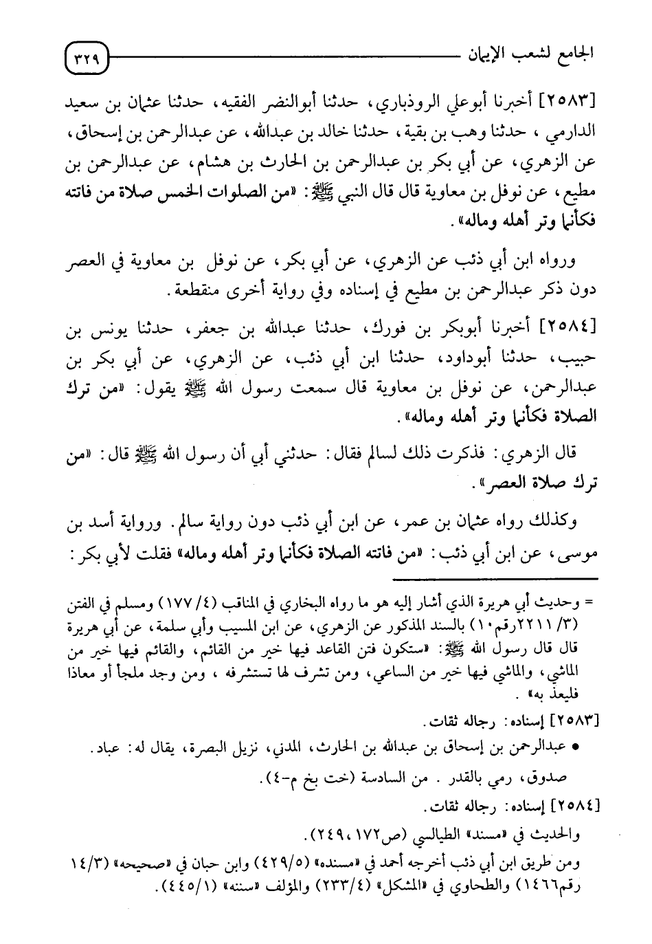 2583 - أَخْبَرَنَا أَبُو عَلِيٍّ الرُّوذْبَارِيُّ، حَدَّثَنَا أَبُو النَّضْرِ الْفَقِيهُ، حَدَّثَنَا عُثْمَانُ بْنُ سَعِيدٍ الدَّارِمِيُّ، حَدَّثَنَا وَهْبُ بْنُ بَقِيَّةَ، حَدَّثَنَا خَالِدُ بْنُ عَبْدِ اللهِ، عَنْ عَبْدِ الرَّحْمَنِ بْنِ إِسْحَاقَ، عَنِ الزُّهْرِيِّ، عَنْ أَبِي بَكْرِ بْنِ عَبْدِ الرَّحْمَنِ بْنِ الْحَارِثِ بْنِ هِشَامٍ، عَنْ عَبْدِ الرَّحْمَنِ بْنِ مُطِيعٍ، عَنْ نَوْفَلِ بْنِ مُعَاوِيَةَ، قَالَ قال النَّبِيُّ صَلَّى اللَّهُ عَلَيْهِ وَسَلَّمَ: §" مِنَ الصَّلَوَاتِ الْخَمْسِ صَلَاةٌ مَنْ فَاتَتْهُ فَكَأَنَّمَا وُتِرَ أَهْلَهُ وَمَالَهُ " وَرَوَاهُ ابْنُ أَبِي ذِئْبٍ، عَنِ الزُّهْرِيِّ، عَنْ أَبِي بَكْرٍ، عَنْ نَوْفَلِ بْنِ مُعَاوِيَةَ فِي الْعَصْرِ دُونَ ذِكْرِ عَبْدِ الرَّحْمَنِ بْنِ مُطِيعٍ فِي إِسْنَادِهِ، وَفِي رِوَايَةٍ أُخْرَى مُنْقَطِعَةٍ
