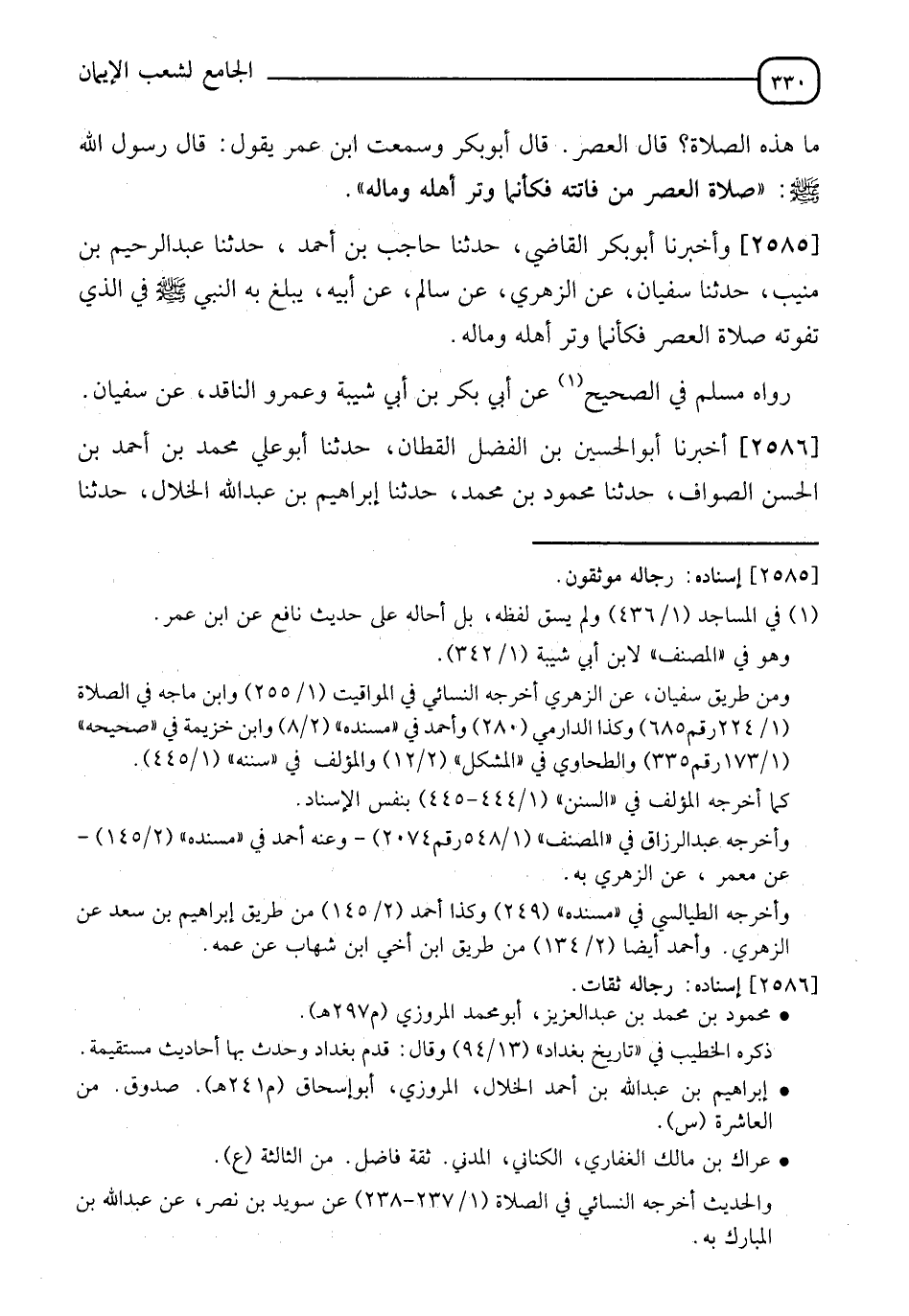 2585 - وأَخْبَرَنَا أَبُو بَكْرٍ الْقَاضِي، حَدَّثَنَا حَاجِبُ بْنُ أَحْمَدَ، حَدَّثَنَا عَبْدُ الرَّحِيمِ بْنُ مُنِيبٍ، حَدَّثَنَا سُفْيَانُ، عَنِ الزُّهْرِيِّ، عَنْ سَالِمٍ، عَنْ أَبِيهِ، يَبْلُغُ بِهِ " النَّبِيَّ صَلَّى اللَّهُ عَلَيْهِ وَسَلَّمَ فِي §الَّذِي تَفُوتُهُ صَلَاةُ الْعَصْرِ فَكَأَنَّمَا وُتِرَ أَهْلَهُ وَمَالَهُ " رَوَاهُ مُسْلِمٌ فِي الصَّحِيحِ، عَنْ أَبِي بَكْرِ بْنِ أَبِي شَيْبَةَ، وَعَمْرِو بْنِ النَّاقِدِ، عَنْ سُفْيَانَ