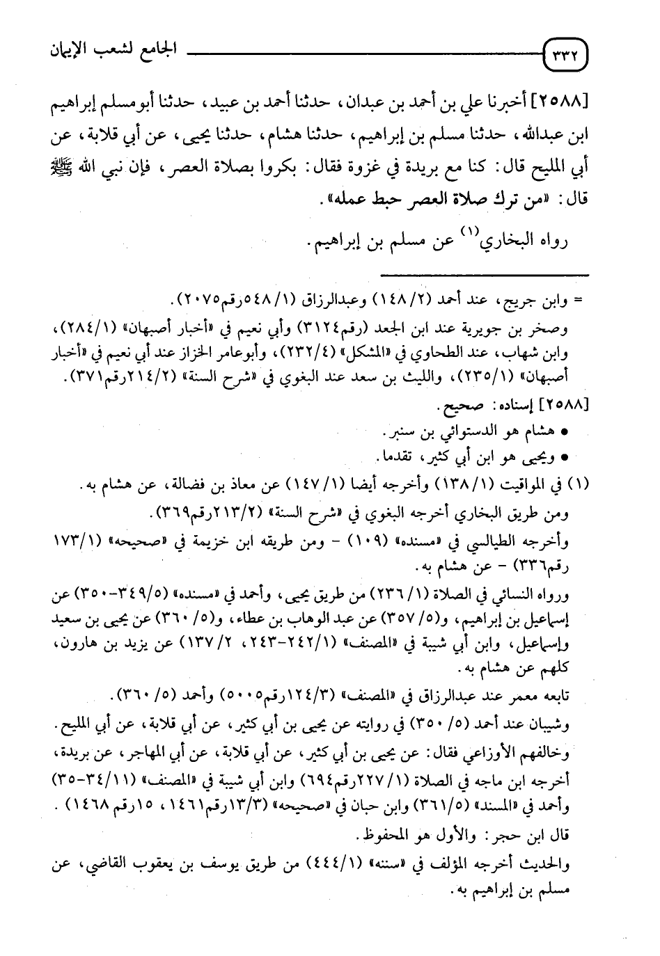 2588 - أَخْبَرَنَا عَلِيُّ بْنُ أَحْمَدَ بْنِ عَبْدَانَ، حَدَّثَنَا أَحْمَدُ بْنُ عُبَيْدٍ، حَدَّثَنَا أَبُو مُسْلِمٍ إِبْرَاهِيمُ بْنُ عَبْدِ اللهِ، حَدَّثَنَا مُسْلِمُ بْنُ إِبْرَاهِيمَ، حَدَّثَنَا هِشَامٌ، حَدَّثَنَا يَحْيَى، عَنْ أَبِي قِلَابَةَ، عَنْ أَبِي الْمَلِيحِ، قَالَ: كُنَّا مَعَ بُرَيْدَةَ فِي غَزْوَةٍ، فَقَالَ: بَكِّرُوا بِصَلَاةِ الْعَصْرِ فَإِنَّ نَبِيَّ اللهِ صَلَّى اللَّهُ عَلَيْهِ وَسَلَّمَ قَالَ: §" مَنْ تَرَكَ صَلَاةَ الْعَصْرِ حَبِطَ عَمَلُهُ " رَوَاهُ الْبُخَارِيُّ عَنْ مُسْلِمِ بْنِ إِبْرَاهِيمَ