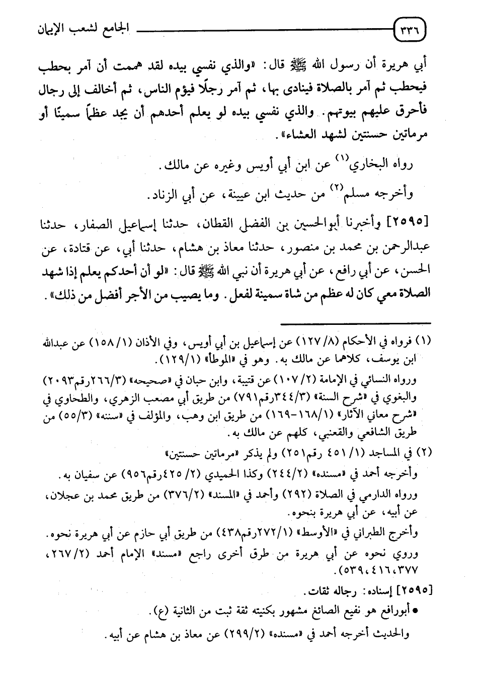 2595 - وأَخْبَرَنَا أَبُو الْحُسَيْنِ بْنُ الْفَضْلِ الْقَطَّانُ، حَدَّثَنَا إِسْمَاعِيلُ الصَّفَّارُ، حَدَّثَنَا عَبْدُ الرَّحْمَنِ بْنُ مُحَمَّدِ بْنِ مَنْصُورٍ، حَدَّثَنَا مُعَاذُ بْنُ هِشَامٍ، حَدَّثَنَا أَبِي، عَنْ قَتَادَةَ، عَنِ الْحَسَنِ، عَنْ أَبِي رَافِعٍ، عَنْ أَبِي هُرَيْرَةَ، أَنَّ نَبِيَّ اللهِ صَلَّى اللَّهُ عَلَيْهِ وَسَلَّمَ قَالَ: " لَوْ أَنَّ أَحَدَكُمْ يَعْلَمُ §إِذَا شَهِدَ الصَّلَاةَ مَعِي كَانَ لَهُ عَظْمٌ مِنْ شَاةٍ سَمِينَةٍ لَفَعَلَ وَمَا يُصِيبُ مِنَ الْأَجْرِ أَفْضَلُ مِنْ ذَلِكَ "