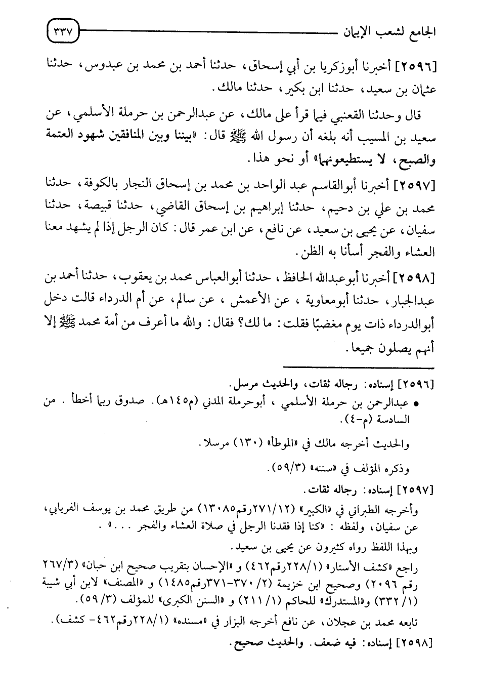 2596 - أَخْبَرَنَا أَبُو زَكَرِيَّا بْنُ أَبِي إِسْحَاقَ، حَدَّثَنَا أَحْمَدُ بْنُ مُحَمَّدِ بْنِ عَبْدُوسٍ، حَدَّثَنَا عُثْمَانُ بْنُ سَعِيدٍ، حَدَّثَنَا ابْنُ بُكَيْرٍ، حَدَّثَنَا مَالِكٌ، قال وَحَدَّثَنَا الْقَعْنَبِيُّ، فِيمَا قَرَأَ عَلَى مَالِكٍ، عَنْ عَبْدِ الرَّحْمَنِ بْنِ حَرْمَلَةَ الْأَسْلَمِيِّ، عَنْ سَعِيدِ بْنِ الْمُسَيِّبِ، أَنَّهُ بَلَغَهُ أَنَّ رَسُولَ اللهِ صَلَّى اللَّهُ عَلَيْهِ وَسَلَّمَ قَالَ: §" بَيْنَنَا وَبَيْنَ الْمُنَافِقِينَ شُهُودُ الْعَتَمَةِ وَالصُّبْحِ لَا يَسْتَطِيعُونَهُمَا " أَوْ نَحْوَ هَذَا