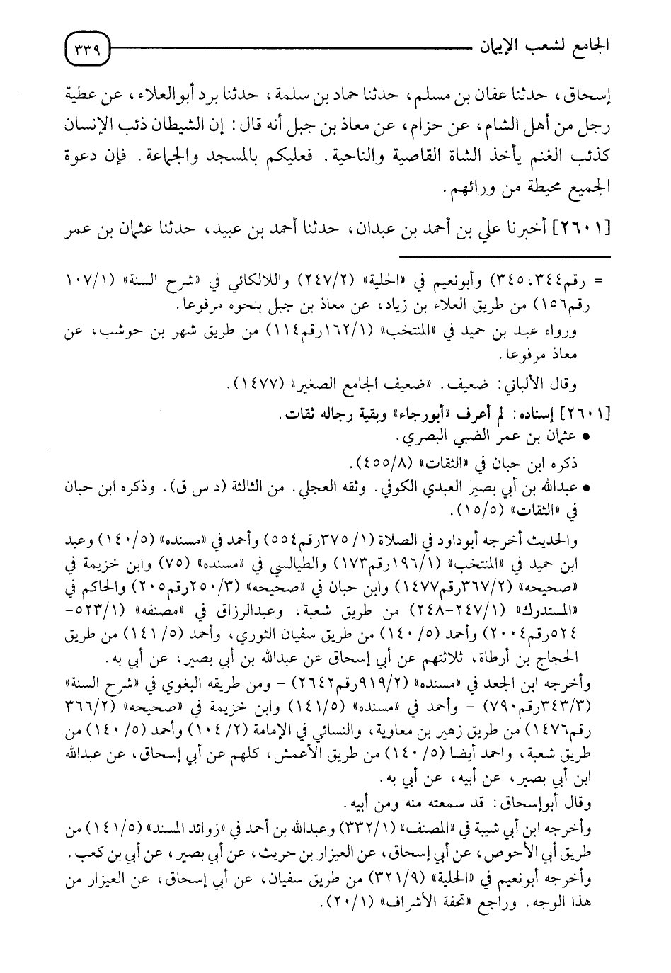 2601 - أَخْبَرَنَا عَلِيُّ بْنُ أَحْمَدَ بْنِ عَبْدَانَ، حَدَّثَنَا أَحْمَدُ بْنُ عُبَيْدٍ، حَدَّثَنَا عُثْمَانُ بْنُ عُمَرَ -[340]- الضَّبِّيُّ، حَدَّثَنَا أبو رَجَاءٍ، حَدَّثَنَا إِسْرَائِيلُ، عَنْ أَبِي إِسْحَاقَ، عَنْ عَبْدِ اللهِ بْنِ أَبِي نُصَيْرٍ، عَنْ أُبَيِّ بْنِ كَعْبٍ، قَالَ: صَلَّى بِنَا رَسُولُ اللهِ صَلَّى اللَّهُ عَلَيْهِ وَسَلَّمَ الصُّبْحَ، ثُمَّ أَقْبَلَ عَلَيْنَا بِوَجْهِهِ، فَقَالَ: " أَشَاهِدٌ فُلَانٌ وَفُلَانٌ وَفُلَانٌ حَتَّى عَدَّ ثَلَاثَةً " كُلُّ ذَلِكَ يَقُولُونَ نَعَمْ، قَالَ: " إِنَّ §أَثْقَلَ الصَّلَاةِ عَلَى الْمُنَافِقِينَ صَلَاةُ الْعِشَاءِ، وَصَلَاةُ الْفَجْرِ، وَلَوْ يَعْلَمُونَ مَا فِيهِمَا لأتَوْهُما وَلَوْ حَبْوًا وَاعْلَمُوا أَنَّ الصَّفَّ الْمُقَدَّمَ عَلَى مَثَلِ صَفِّ الْمَلَائِكَةِ، ولَوْ عَلِمْتُمْ فَضِيلَتَهُ لَابْتَدَرْتُمُوهُ، وَاعْلَمُوا أَنَّ صَلَاةَ الرَّجُلِ مَعَ الرَّجُلِ أَزْكَى مِنْ صَلَاةِ الرَّجُلِ وَحْدَهُ، وَإِنَّ صَلَاتَهُ مَعَ الرِّجْلَيْنِ أَزْكَى مِنْ صَلَاتِهِ مَعَ الرَّجُلِ، وَمَا كَثُرَ أَحَبُّ إِلَى اللهِ عَزَّ وَجَلَّ "