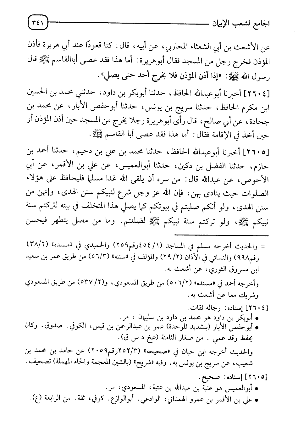 2605 - أَخْبَرَنَا أَبُو عَبْدِ اللهِ الْحَافِظُ، حَدَّثَنَا مُحَمَّدُ بْنُ عَلِيِّ بْنِ دُحَيْمٍ، حَدَّثَنَا أَحْمَدُ بْنُ حَازِمٍ، حَدَّثَنَا الْفَضْلُ بْنُ دُكَيْنٍ، حَدَّثَنَا أَبُو الْعُمَيْسِ، عَنْ عَلِيِّ بْنِ الْأَقْمَرِ، عَنْ أَبِي الْأَحْوَصِ، عَنْ عَبْدِ اللهِ، قَالَ: §" مَنْ سَرَّهُ أَنْ يَلْقَى اللهَ غَدًا مُسْلِمًا فَلْيُحَافِظْ عَلَى هَؤُلَاءِ الصَّلَوَاتِ حَيْثُ يُنَادَى بِهِنَّ فَإِنَّ اللهَ عَزَّ وَجَلَّ شَرَعَ لِنَبِيِّكُمْ سُنَنَ الْهُدَى، وَإِنَّهُنَّ مِنْ سُنَنِ الْهُدَى، وَلَوْ أَنَّكُمْ صَلَّيْتُمْ فِي بُيُوتِكُمْ كَمَا يُصَلِّي هَذَا الْمُتَخَلِّفُ فِي بَيْتِهِ لَتَرَكْتُمْ سُنَّةَ نَبِيِّكُمْ صَلَّى اللَّهُ عَلَيْهِ وَسَلَّمَ، وَلَوْ تَرَكْتُمْ سُنَّةَ نَبِيِّكُمْ صَلَّى اللَّهُ عَلَيْهِ وَسَلَّمَ لَضَلَلْتُمْ، وَمَا مِنْ مُصَلٍّ يَتَطَهَّرُ فَيُحْسِنُ -[342]- الطُّهُورَ، ثُمَّ يَعْمِدُ إِلَى مَسْجِدٍ مِنْ هَذِهِ الْمَسَاجِدِ إِلَّا كَتَبَ اللهُ لَهُ بِكُلِّ خُطْوَةٍ يَخْطُوهَا حَسَنَةً، وَرَفَعَ لَهُ بِهَا دَرَجَةً، وَحَطَّ عَنْهُ بِهَا سَيِّئَةً، وَلَقَدْ رَأَيْتُنَا وَمَا يَتَخَلَّفُ عَنْهَا إِلَّا مُنَافِقٌ قَدْ عُلِمَ نِفَاقُهُ، وَلَقَدْ كَانَ الرَّجُلُ يُهَادَى بَيْنَ الرِّجْلَيْنِ حَتَّى يُقَامَ فِي الصَّفِّ " رَوَاهُ مُسْلِمٌ، عَنْ أَبِي بَكْرِ بْنِ أَبِي شَيْبَةَ، عَنْ أَبِي نُعَيْمٍ