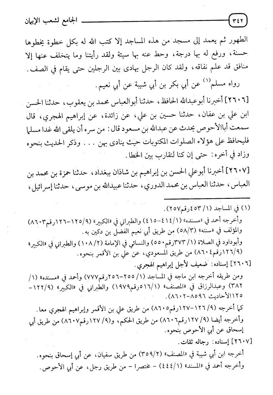 2606 - أَخْبَرَنَا أَبُو عَبْدِ اللهِ الْحَافِظُ، حَدَّثَنَا أَبُو الْعَبَّاسِ مُحَمَّدُ بْنُ يَعْقُوبَ، حَدَّثَنَا الْحَسَنُ بْنُ عَلِيِّ بْنِ عَفَّانَ، حَدَّثَنَا حُسَيْنُ بْنُ عَلِيٍّ، عَنْ زَائِدَةَ، عَنْ إِبْرَاهِيمَ الْهَجَرِيِّ، قَالَ: سَمِعْتُ أَبَا الْأَحْوَصِ، يُحَدِّثُ عَنْ عَبْدِ اللهِ بْنِ مَسْعُودٍ، قَالَ: §" مَنْ سَرَّهُ أَنْ يَلْقَى اللهَ غَدًا مُسْلِمًا فَلْيُحَافِظْ عَلَى هَؤُلَاءِ الصَّلَوَاتِ الْمَكْتُوبَاتِ حَيْثُ يُنَادَى بِهِنَّ " وَذَكَرَ الْحَدِيثَ بِنَحْوِهِ، وَزَادَ فِي آخِرِهِ " حَتَّى إِنْ كُنَّا لَنُقَارِبُ بَيْنَ الْخُطَا "