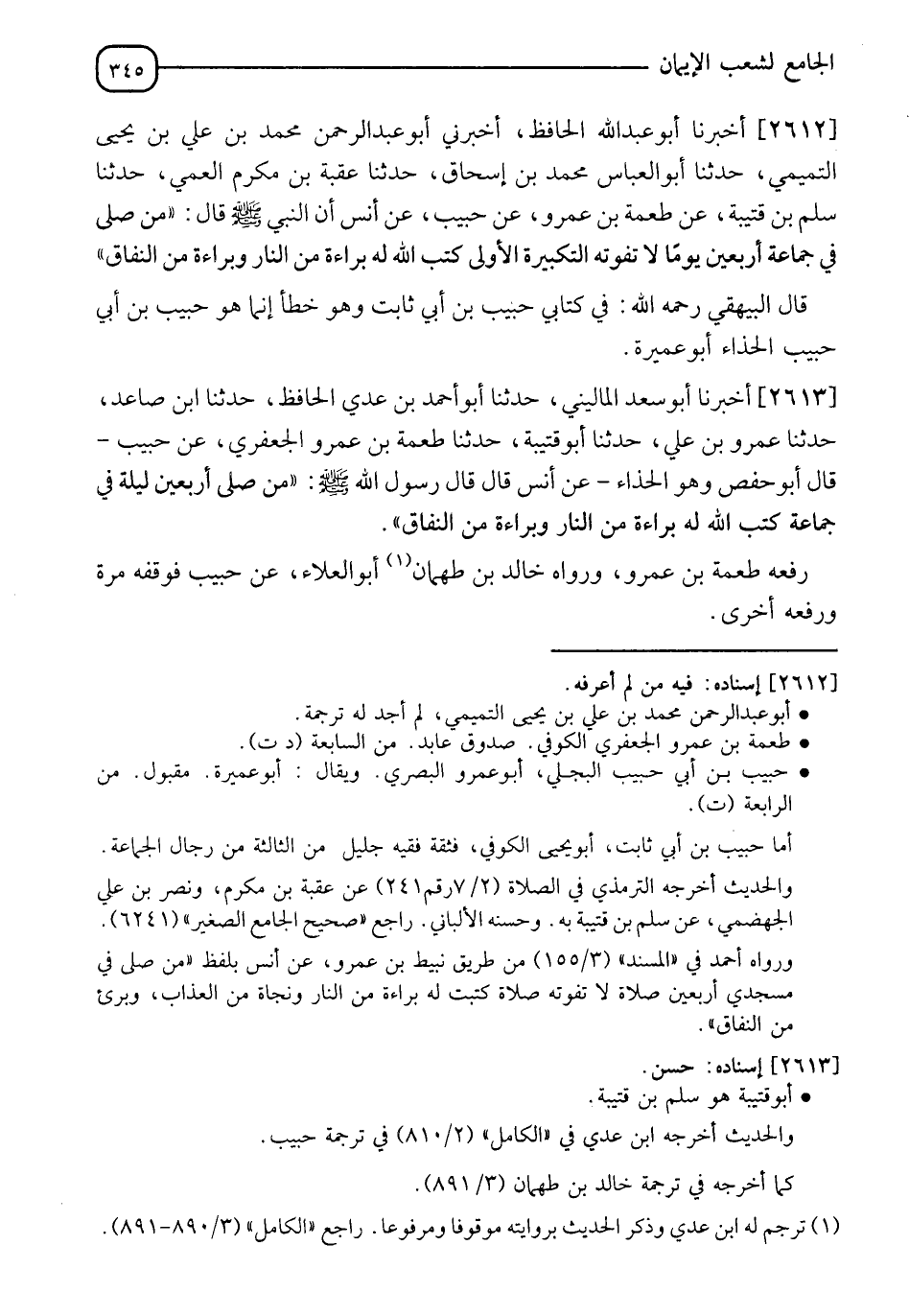 2612 - أَخْبَرَنَا أَبُو عَبْدِ اللهِ الْحَافِظُ، أَخْبَرَنِي أَبُو عَبْدِ الرَّحْمَنِ مُحَمَّدُ بْنُ عَلِيِّ بْنِ يَحْيَى التَّمِيمِيُّ، حَدَّثَنَا أَبُو الْعَبَّاسِ مُحَمَّدُ بْنُ إِسْحَاقَ، حَدَّثَنَا عُقْبَةُ بْنُ مُكْرَمٍ الْعَمِّيُّ، حَدَّثَنَا سَلْمُ بْنُ قُتَيْبَةَ، عَنْ طُعْمَةَ بْنِ عَمْرٍو، عَنْ حَبِيبٍ، عَنْ أَنَسٍ، أَنَّ النَّبِيَّ صَلَّى اللَّهُ عَلَيْهِ وَسَلَّمَ قَالَ: §" مَنْ صَلَّى فِي جَمَاعَةٍ أَرْبَعِينَ يَوْمًا لَا تَفُوتُهُ التَّكْبِيرَةُ الْأُولَى كَتَبَ اللهُ لَهُ بَرَاءَةً مِنَ النَّارِ، وَبَرَاءَةً مِنَ النِّفَاقِ " قَالَ الْبَيْهَقِيُّ رَحِمَهُ اللهُ: " فِي كِتَابِي حَبِيبُ بْنُ أَبِي ثَابِتٍ وَهُوَ خَطَأٌ إِنَّمَا هُوَ حَبِيبُ بْنُ أَبِي حَبِيبٍ الْحَذَّاءُ أَبُو عُمَيْرَةَ "