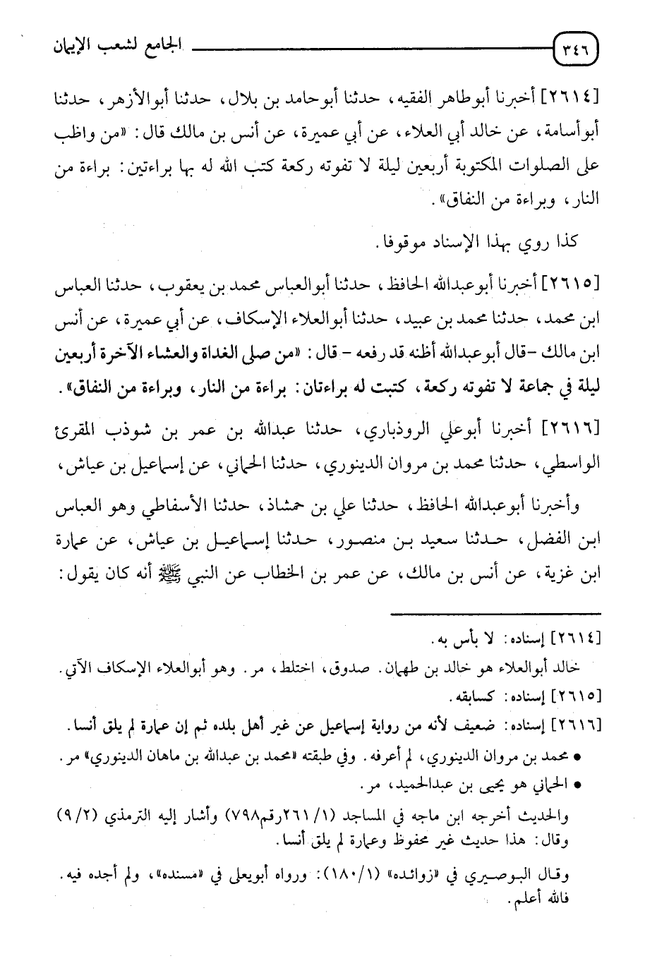 2615 - أَخْبَرَنَا أَبُو عَبْدِ اللهِ الْحَافِظُ، حَدَّثَنَا أَبُو الْعَبَّاسِ مُحَمَّدُ بْنُ يَعْقُوبَ، حَدَّثَنَا الْعَبَّاسُ بْنُ مُحَمَّدٍ، حَدَّثَنَا مُحَمَّدُ بْنُ عُبَيْدٍ، حَدَّثَنَا أَبُو الْعَلَاءِ الْإَسْكافُ، عَنْ أَبِي عَمِيرَةَ، عَنْ أَنَسِ بْنِ مَالِكٍ، - قَالَ أَبُو عَبْدِ اللهِ أَظُنُّهُ قَدْ رَفَعَهُ - قَالَ: §" مَنْ صَلَّى الْغَدَاةَ، وَالْعِشَاءَ الْآخِرَةَ أربعين ليلة فِي جَمَاعَةٍ لَا تَفُوتُهُ رَكْعَةٌ كُتِبت لَهُ بَرَاءَتَانِ، بَرَاءَةٌ مِنَ النَّارِ، وَبَرَاءَةٌ مِنَ النِّفَاقِ "