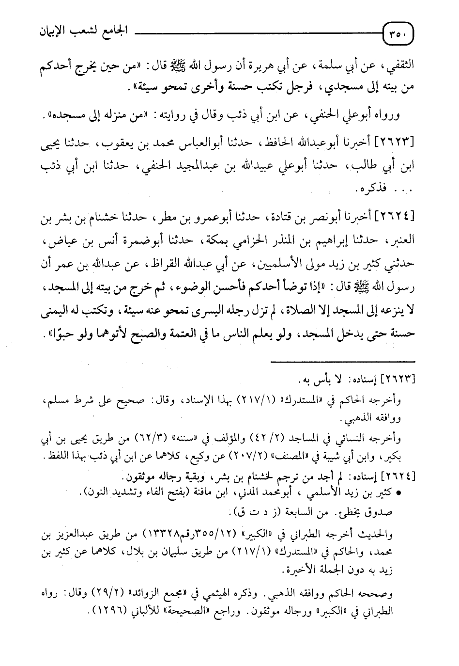 2624 - أَخْبَرَنا أَبُو نَصْرِ بْنُ قَتَادَةَ، حَدَّثَنَا أَبُو عَمْرِو بْنُ مَطَرٍ، حَدَّثَنَا خَشْنامُ بْنُ بِشْرٍ بن الْعَنْبَرِ، حَدَّثَنَا إِبْرَاهِيمُ بْنُ الْمُنْذِرِ الْحِزَامِيُّ، بِمَكَّةَ، حَدَّثَنَا أَبُو ضَمْرَةَ أَنَسُ بْنُ عِيَاضٍ، حَدَّثَنِي كَثِيرُ بْنُ زَيْدٍ، مَوْلَى الْأَسْلَمِيِّينَ، عَنْ أَبِي عَبْدِ اللهِ الْقَرَّاظِ، عَنْ عَبْدِ اللهِ بْنِ عُمَرَ، أَنَّ رَسُولَ اللهِ صَلَّى اللَّهُ عَلَيْهِ وَسَلَّمَ قَالَ: §" إِذَا تَوَضَّأَ أَحَدُكُمْ فَأَحْسَنَ الْوُضُوءِ ثُمَّ خَرَجَ مِنْ بَيْتِهِ إِلَى الْمَسْجِدِ لَا يَنْزِعُهُ إِلَى الْمَسْجِدِ إِلَّا الصَّلَاةُ لَمْ تَزَلْ رِجْلُهُ الْيُسْرَى تَمْحُو عَنْهُ سَيِّئَةً، وَتَكْتُبُ لَهُ الْيُمْنَى حَسَنَةً حَتَّى يَدْخُلَ الْمَسْجِدَ، وَلَوْ يَعْلَمُ النَّاسَ مَا فِي الْعَتَمَةِ وَالصُّبْحِ لَأَتَوْهُمَا وَلَوْ حَبْوًا "