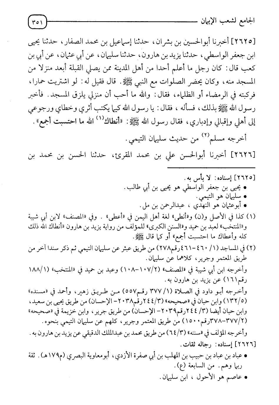 2625 - أَخْبَرَنا أَبُو الْحُسَيْنِ بْنُ بِشْرانَ، حَدَّثَنَا إِسْمَاعِيلُ بْنُ مُحَمَّدٍ الصَّفَّارُ، حَدَّثَنَا يَحْيَى بْنُ جَعْفَرٍ الْوَاسِطِيُّ، حَدَّثَنَا يَزِيدُ بْنُ هَارُونَ، حَدَّثَنَا سُلَيْمَانُ، عَنْ أَبِي عُثْمَانَ، عَنْ أُبَيِّ بْنِ كَعْبٍ، قَالَ: كَانَ رَجُلٌ مَا أَعْلَمُ أَحَدًا مِنْ أَهْلِ الْمَدِينَةِ مِمَّنْ يُصَلِّي والْقِبْلَةَ أَبَعْدَ مَنْزِلًا مِنَ الْمَسْجِدِ مِنْهُ، وَكَانَ يَحْضُرُ الصَّلَوَاتِ مَعَ النَّبِيِّ صَلَّى اللَّهُ عَلَيْهِ وَسَلَّمَ قَالَ: فَقِيلَ لَهُ لَوِ اشْتَرَيْتَ حِمَارًا فَرَكِبْتَهُ فِي الرَّمْضَاءِ أَوِ الظَّلْمَاءِ، فَقَالَ: وَاللهِ مَا أُحِبُّ أَنَّ مَنْزِلِي يَلْزَقُ الْمَسْجِدَ، فَأُخْبِرَ رَسُولُ اللهِ صَلَّى اللَّهُ عَلَيْهِ وَسَلَّمَ بِذَلِكَ، فَسَأَلَهُ: فَقَالَ: يَا رَسُولَ اللهِ كَيْمَا يُكْتَبُ أَثَرِي، وَخُطَايَ، وَرُجُوعِي إِلَى أَهْلِي، وَإِقْبَالِي، وَإِدْبَارِي، فَقَالَ رَسُولُ اللهِ صَلَّى اللَّهُ عَلَيْهِ وَسَلَّمَ: §" أَعْطَاكَ اللهُ مَا احْتَسَبْتَ أَجْمَعَ " أَخْرَجَهُ مُسْلِمٌ مِنْ حَدِيثِ سُلَيْمَانَ التَّيْمِيِّ