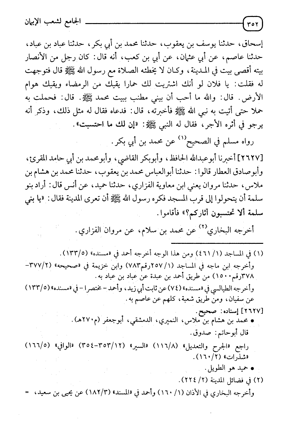 2627 - أَخْبَرَنَا أَبُو عَبْدِ اللهِ الْحَافِظُ، وَأَبُو بَكْرٍ الْقَاضِي، وَأَبُو مُحَمَّدِ بْنُ أبي حَامِدٍ الْمُقْرِئُ، وَأَبُو صَادِقٍ الْعَطَّارُ، قَالُوا: حَدَّثَنَا أَبُو الْعَبَّاسِ مُحَمَّدُ بْنُ يَعْقُوبَ، حَدَّثَنَا مُحَمَّدُ بْنُ هِشَامِ بْنِ مَلَاسٍ، حَدَّثَنَا مَرْوَانُ يَعْنِي ابْنَ مُعَاوِيَةَ الْفَزَارِيَّ، حَدَّثَنَا حُمَيْدٌ، عَنْ أَنَسٍ، قَالَ: أَرَادَ بَنُو سَلَمَةَ أَنْ يَتَحَوَّلُوا إِلَى قُرْبِ الْمَسْجِدِ فَكَرِهَ رَسُولُ اللهِ صَلَّى اللَّهُ عَلَيْهِ وَسَلَّمَ أَنْ تُعْرَّى الْمَدِينَةُ فَقَالَ: " يَا بَنِي سَلِمَةَ §أَلَا تَحْتَسِبُونَ آثَارَكُمْ " فَأَقَامُوا أَخْرَجَهُ الْبُخَارِيُّ، عَنْ مُحَمَّدِ بْنِ سَلَامٍ، عَنْ مَرْوَانَ الْفَزَارِيِّ