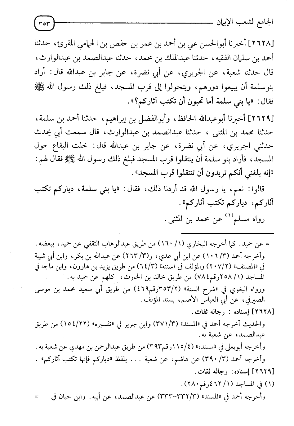 2629 - أَخْبَرَنَا أَبُو عَبْدِ اللهِ الْحَافِظُ، وأَبُو الْفَضْلِ بْنُ إِبْرَاهِيمَ، حَدَّثَنَا أَحْمَدُ بْنُ سَلَمَةَ، حَدَّثَنَا مُحَمَّدُ بْنُ الْمُثَنَّى، حَدَّثَنَا عَبْدُ الصَّمَدِ بْنُ عَبْدِ الْوَارِثِ، قَالَ: سَمِعْتُ أَبِي يُحَدِّثُ، حَدَّثَنِي الْجُرَيْرِيُّ، عَنْ أَبِي نَضْرَةَ، عَنْ جَابِرِ بْنِ عَبْدِ اللهِ، قَالَ: خَلَتِ الْبِقَاعُ حَوْلَ الْمَسْجِدِ فَأَرَادَ بَنُو سَلِمَةَ أَنْ يَنْتَقِلُوا قُرْبَ الْمَسْجِدِ فَبَلَغَ ذَلِكَ رَسُولَ اللهِ صَلَّى اللَّهُ عَلَيْهِ وَسَلَّمَ فَقَالَ لَهُمْ: " إِنَّهُ بَلَغَنِي أَنَّكُمْ تُرِيدُونَ أَنْ تَنْتَقِلُوا قُرْبَ الْمَسْجِدِ " قَالُوا: نَعَمْ يَا رَسُولَ اللهِ قَدْ أَرَدْنَا ذَلِكَ فَقَالَ: " يَا بَنِي سَلَمَةَ §دِيَارُكُمْ تَكْتُبُ آثَارَكُمْ، دِيَارُكُمْ تَكْتُبُ آثَارَكُمْ " رَوَاهُ مُسْلِمٌ عَنْ مُحَمَّدِ بْنِ الْمُثَنَّى