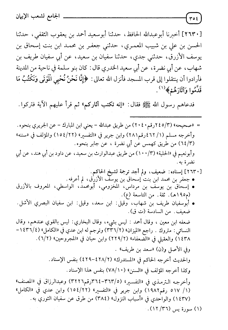 2630 - أَخْبَرَنَا أَبُو عَبْدِ اللهِ الْحَافِظُ، حَدَّثَنَا أَبُو سَعِيدٍ أَحْمَدُ بْنُ يَعْقُوبَ الثَّقَفِيُّ، حَدَّثَنَا الْحَسَنُ بْنُ عَلِيِّ بْنِ شَبِيبٍ الْمَعْمَرِيُّ، حَدَّثَنِي جَعْفَرُ بْنُ مُحَمَّدِ ابْنِ بِنْتِ إِسْحَاقَ بْنِ يُوسُفَ الْأَزْرَقُ، حَدَّثَنِي جَدِّي، حَدَّثَنَا سُفْيَانُ بْنُ سَعِيدٍ، عَنْ أَبِي سُفْيَانَ طَرِيفِ بْنِ شِهَابٍ، عَنْ أَبِي نَضْرَةَ، عَنْ أَبِي سَعِيدٍ الْخُدْرِيِّ، قَالَ: كَانَ بَنُو سَلَمَةَ فِي نَاحِيَةٍ مِنَ الْمَدِينَةِ فَأَرَادُوا أَنْ يَنْتَقِلُوا إِلَى قُرْبِ الْمَسْجِدِ فَأَنْزَلَ اللهُ تَعَالَى: {إِنَّا نَحْنُ نُحْيِي الْمَوْتَى وَنَكْتُبُ مَا قَدَّمُوا وَآثَارَهُمْ} [يس: 12] فَدَعَاهُمْ رَسُولُ اللهِ صَلَّى اللَّهُ عَلَيْهِ وَسَلَّمَ فَقَالَ: " إِنَّهُ §تُكْتَبُ آثَارُكُمْ "، ثُمَّ قَرَأَ عَلَيْهِمُ الْآيَةَ فَتَرَكُوا