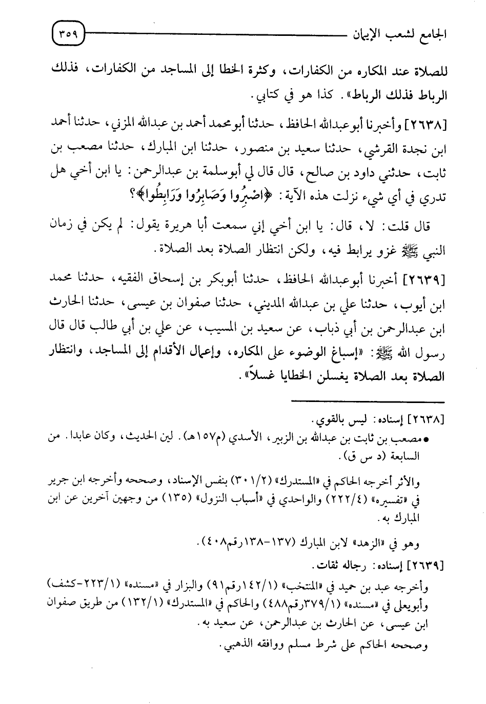 2638 - وَأَخْبَرَنَا أَبُو عَبْدِ اللهِ الْحَافِظُ، حَدَّثَنَا أَبُو مُحَمَّدٍ أَحْمَدُ بْنُ عَبْدِ اللهِ الْمُزَنِيُّ، حَدَّثَنَا أَحْمَدُ بْنُ نَجْدَةَ الْقُرَشِيُّ، حَدَّثَنَا سَعِيدُ بْنُ مَنْصُورٍ، حَدَّثَنَا ابْنُ الْمُبَارَكِ، حَدَّثَنَا مُصْعَبُ بْنُ ثَابِتٍ، حَدَّثَنِي دَاوُدُ بْنُ صَالِحٍ، قَالَ: قَالَ لِي أَبُو سَلَمَةَ بْنُ عَبْدِ الرَّحْمَنِ: يَا ابْنَ أَخِي، هَلْ تَدْرِي فِي أَيِّ شَيْءٍ نَزَلَتْ هَذِهِ الْآيَةُ: {اصْبِرُوا وَصَابِرُوا وَرَابِطُوا} [آل عمران: 200]؟ قَالَ: قُلْتُ: لَا، قَالَ: يَا ابْنَ أَخِي، إِنِّي سَمِعْتُ أَبَا هُرَيْرَةَ يَقُولُ: §" لَمْ يَكُنْ فِي زَمَانِ النَّبِيِّ صَلَّى اللَّهُ عَلَيْهِ وَسَلَّمَ غَزْوٌ يُرَابَطُ فِيهِ، وَلَكِنِ انْتِظَارُ الصَّلَاةِ بَعْدَ الصَّلَاةِ "