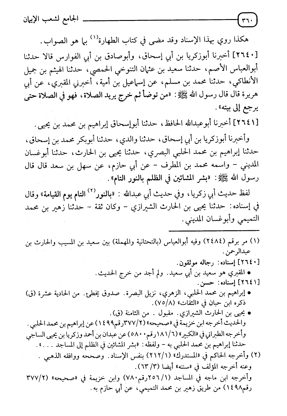 2641 - أَخْبَرَنَا أَبُو عَبْدِ اللهِ الْحَافِظُ، حَدَّثَنَا أَبُو إِسْحَاقَ إِبْرَاهِيمُ بْنُ مُحَمَّدِ بْنِ يَحْيَى، وَأَخْبَرَنَا أَبُو زَكَرِيَّا بْنُ أَبِي إِسْحَاقَ، حَدَّثَنَا وَالِدِي، حَدَّثَنَا أَبُو بَكْرٍ مُحَمَّدُ بْنُ إِسْحَاقَ، حَدَّثَنَا إِبْرَاهِيمُ بْنُ مُحَمَّدٍ الْحَلَبِيُّ، البَصْرِيٌّ، حَدَّثَنَا يَحْيَى بْنُ الْحَارِثِ، حَدَّثَنَا أَبُو غَسَّانَ الْمَدِينِيُّ وَاسْمُهُ مُحَمَّدُ بْنُ الْمُطَرِّفِ، عَنْ أَبِي حَازِمٍ، عَنْ سَهْلِ بْنِ سَعْدٍ، قَالَ: قَالَ رَسُولُ اللهِ صَلَّى اللَّهُ عَلَيْهِ وَسَلَّمَ: §" بَشِّرِ الْمَشَّائِينَ فِي الظُّلَمِ بِالنُّورِ التَّامِّ " لَفْظُ حَدِيثِ أَبِي زَكَرِيَّا، وَفِي حَدِيثِ أَبِي عَبْدِ اللهِ: " بِالنُّورِ التَّامِّ يَوْمَ الْقِيَامَةِ "، وَقَالَ فِي إِسْنَادِهِ: حَدَّثَنَا يَحْيَى بْنُ الْحَارِثِ الشِّيرَازِيُّ وَكَانَ ثِقَةً، حَدَّثَنَا زُهَيْرُ بْنُ مُحَمَّدٍ التَّمِيمِيُّ، وَأَبُو غَسَّانَ الْمَدِينِيُّ