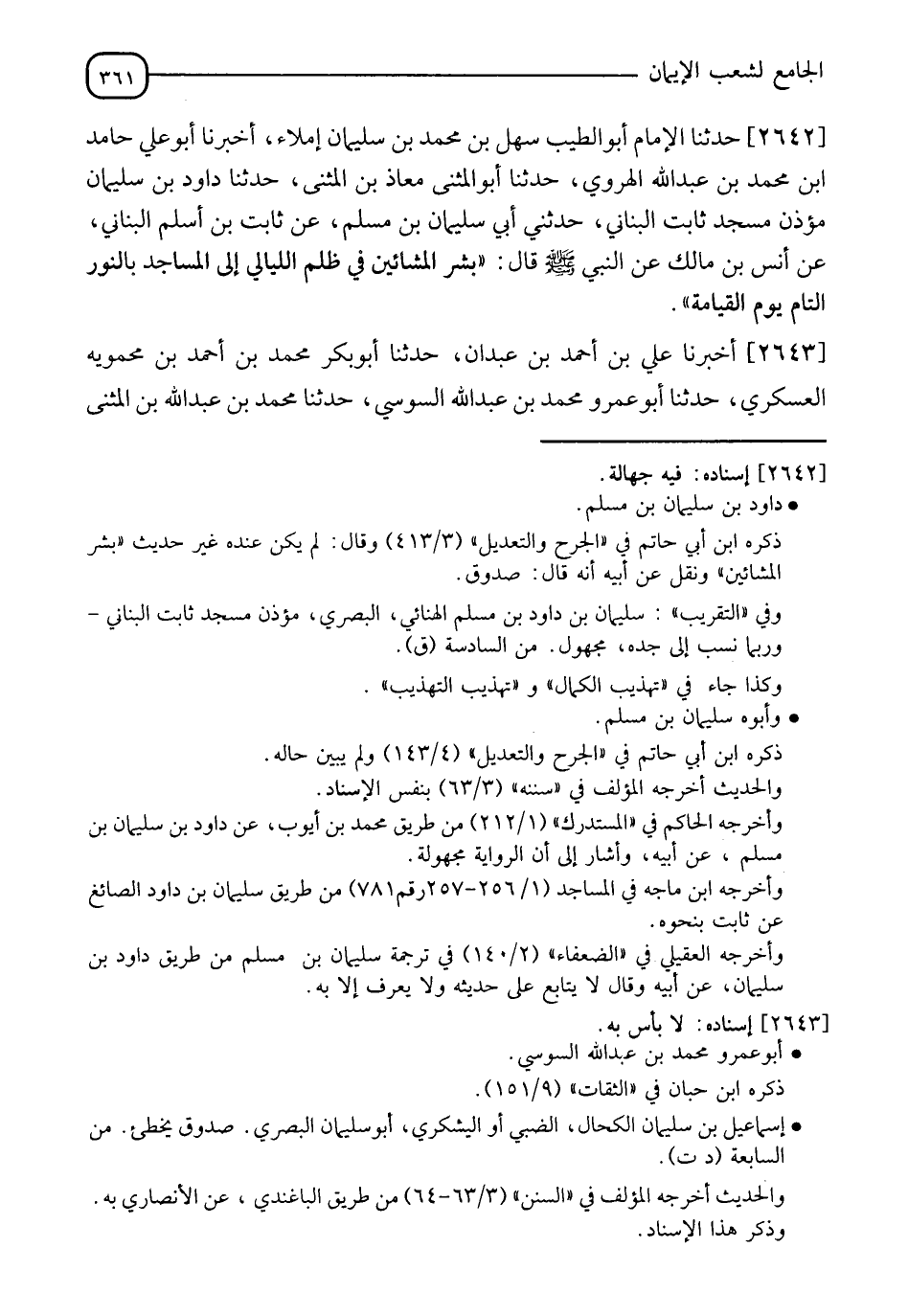 2642 - حَدَّثَنَا الْإِمَامُ أَبُو الطَّيِّبِ سَهْلُ بْنُ مُحَمَّدِ بْنِ سُلَيْمَانَ إِمْلَاءً، أَخْبَرَنَا أَبُو عَلِيٍّ حَامِدُ بْنُ مُحَمَّدِ بْنِ عَبْدِ اللهِ الْهَرَوِيُّ، حَدَّثَنَا أَبُو الْمُثَنَّى مُعَاذُ بْنُ الْمُثَنَّى، حَدَّثَنَا دَاوُدُ بْنُ سُلَيْمَانَ، مُؤَذِّنُ مَسْجِدِ ثَابِتٍ الْبُنَانِيِّ، حَدَّثَنِي أَبِي سُلَيْمَانُ بْنُ مُسْلِمٍ، عَنْ ثَابِتِ بْنِ أَسْلِمَ الْبُنَانِيِّ، عَنْ أَنَسِ بْنِ مَالِكٍ، عَنِ النَّبِيِّ صَلَّى اللَّهُ عَلَيْهِ وَسَلَّمَ قَالَ: §" بَشِّرِ الْمَشَّائِينَ فِي ظُلَمِ اللَّيَالِي إِلَى الْمَسَاجِدِ بِالنُّورِ التَّامِّ يَوْمَ الْقِيَامَةِ "