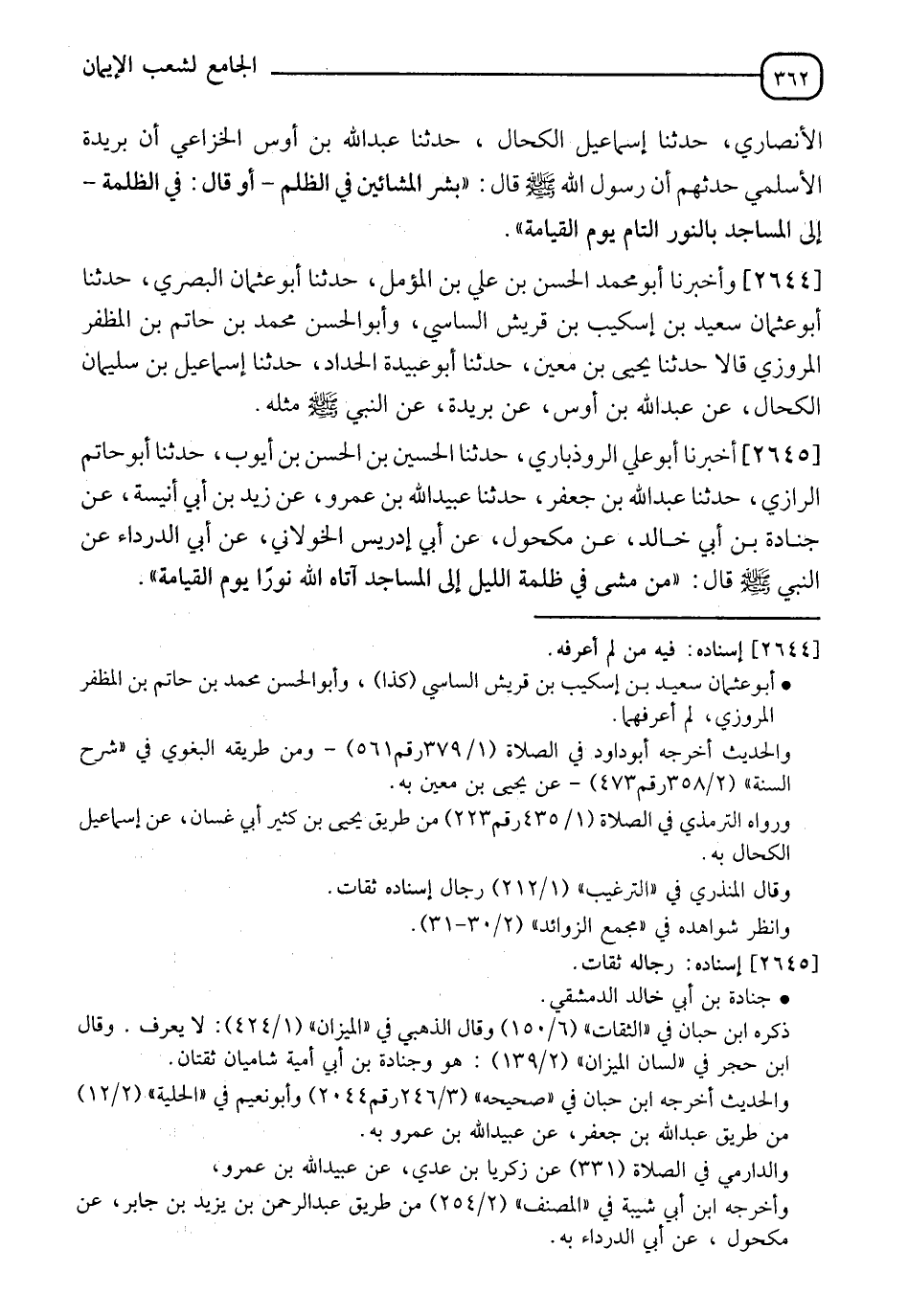 2645 - أَخْبَرَنَا أَبُو عَلِيٍّ الرُّوذْبَارِيُّ، حَدَّثَنَا الْحُسَيْنُ بْنُ الْحَسَنِ بْنِ أَيُّوبَ، حَدَّثَنَا أَبُو حَاتِمٍ الرَّازِيُّ، حَدَّثَنَا عَبْدُ اللهِ بْنُ جَعْفَرٍ، حَدَّثَنَا عُبَيْدُ اللهِ بْنُ عَمْرٍو، عَنْ زَيْدِ بْنِ أَبِي أُنَيْسَةَ، عَنْ جُنَادَةَ بْنِ أَبِي خَالِدٍ، عَنْ مَكْحُولٍ، عَنْ أَبِي إِدْرِيسَ الْخَوْلَانِيِّ، عَنْ أَبِي الدَّرْدَاءِ، عَنِ النَّبِيِّ صَلَّى اللَّهُ عَلَيْهِ وَسَلَّمَ قَالَ: §" مَنْ مَشَى فِي ظُلْمَةِ اللَّيْلِ إِلَى الْمَسَاجِدِ أَتَاهُ اللهُ نُورًا يَوْمَ الْقِيَامَةِ "