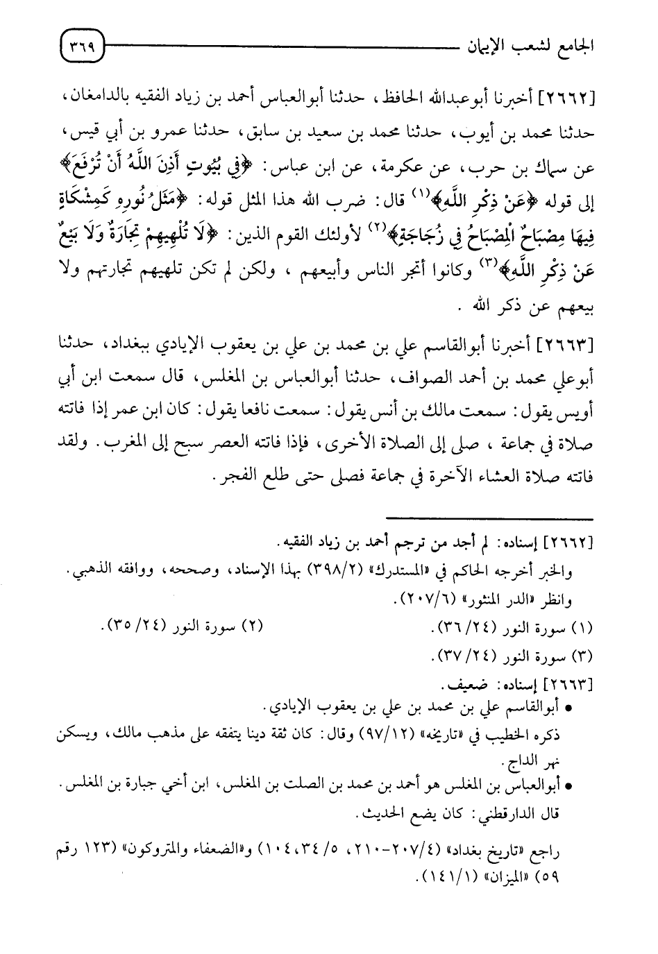2662 - أَخْبَرَنَا أَبُو عَبْدِ اللهِ الْحَافِظُ، حَدَّثَنَا أَبُو الْعَبَّاسِ أَحْمَدُ بْنُ زِيَادٍ الْفَقِيهُ بِالدَّامِغَانِ، حَدَّثَنَا مُحَمَّدُ بْنُ أَيُّوبَ، حَدَّثَنَا مُحَمَّدُ بْنُ سَعِيدِ بْنِ سَابَقٍ، حَدَّثَنَا عَمْرُو بْنُ أَبِي قَيْسٍ، عَنْ سِمَاكِ بْنِ حَرْبٍ، عَنْ عِكْرِمَةَ، عَنِ ابْنِ عَبَّاسٍ، {فِي بُيُوتٍ أَذِنَ اللهُ أَنْ تُرْفَعَ} [النور: 36] إِلَى قَوْلِهِ: {عنْ ذِكْرِ اللهِ} [المائدة: 91] قَالَ: ضَرَبَ اللهُ هَذَا الْمَثَلَ قَوْلُهُ: {مَثَلُ نُورِهِ كَمِشْكَاةٍ فِيهَا مِصْبَاحٌ الْمِصْبَاحُ فِي زُجَاجَةٍ} [النور: 35] لِأُولَئِكَ الْقَوْمِ الَّذِينَ: {لَا تُلْهِيهِمْ تِجَارَةٌ وَلَا بَيْعٌ عَنْ ذِكْرِ اللهِ} [النور: 37] " وَكَانُوا §أَتْجَرَ النَّاسِ وَأَبْيَعَهُمْ، وَلَكِنْ لَمْ تَكُنْ تُلْهِيهِمْ تِجَارَتُهُمْ وَلَا بَيْعُهُمْ عَنْ ذِكْرِ اللهِ "