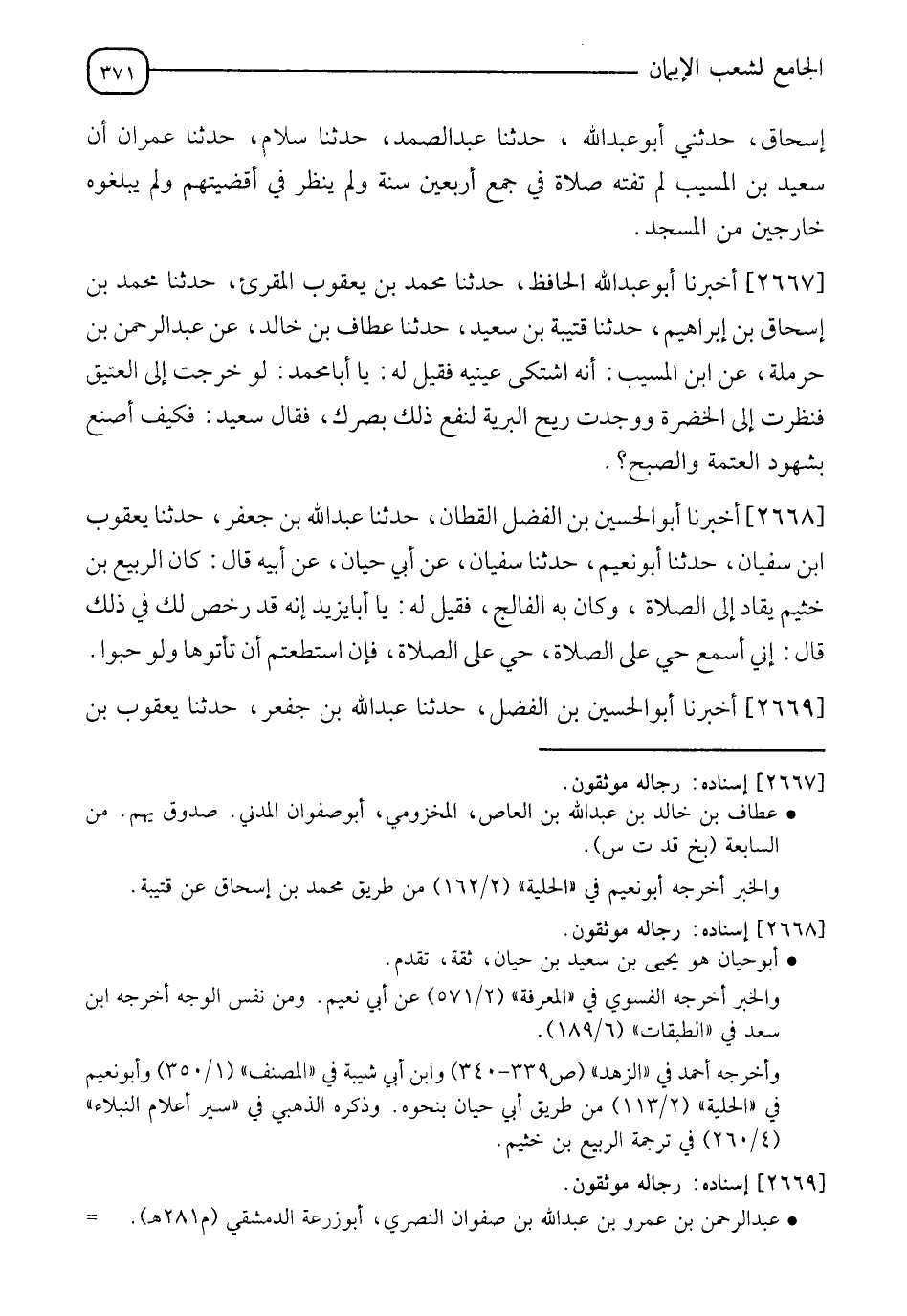 2668 - أَخْبَرَنَا أَبُو الْحُسَيْنِ بْنُ الْفَضْلِ الْقَطَّانُ، حَدَّثَنَا عَبْدُ اللهِ بْنُ جَعْفَرٍ، حَدَّثَنَا يَعْقُوبُ بْنُ سُفْيَانَ، حَدَّثَنَا أَبُو نُعَيْمٍ، حَدَّثَنَا سُفْيَانُ، عَنْ أَبِي حَيَّانَ، عَنْ أَبِيهِ، قَالَ: كَانَ الرَّبِيعُ بْنُ خَثْيَمٍ يُقَادُ إِلَى الصَّلَاةِ وَكَانَ بِهِ الْفَالِجُ فَقِيلَ لَهُ: يَا أَبَا يَزِيدَ إِنَّهُ قَدْ رُخِّصَ لَكَ فِي ذَلِكَ قَالَ: " إِنِّي §أَسْمَعُ حَيَّ عَلَى الصَّلَاةِ حَيَّ عَلَى الْصَّلَاةِ فَإِنِ اسْتَطَعْتُمْ أَنْ تَأْتُوهَا وَلَوْ حَبْوًا "