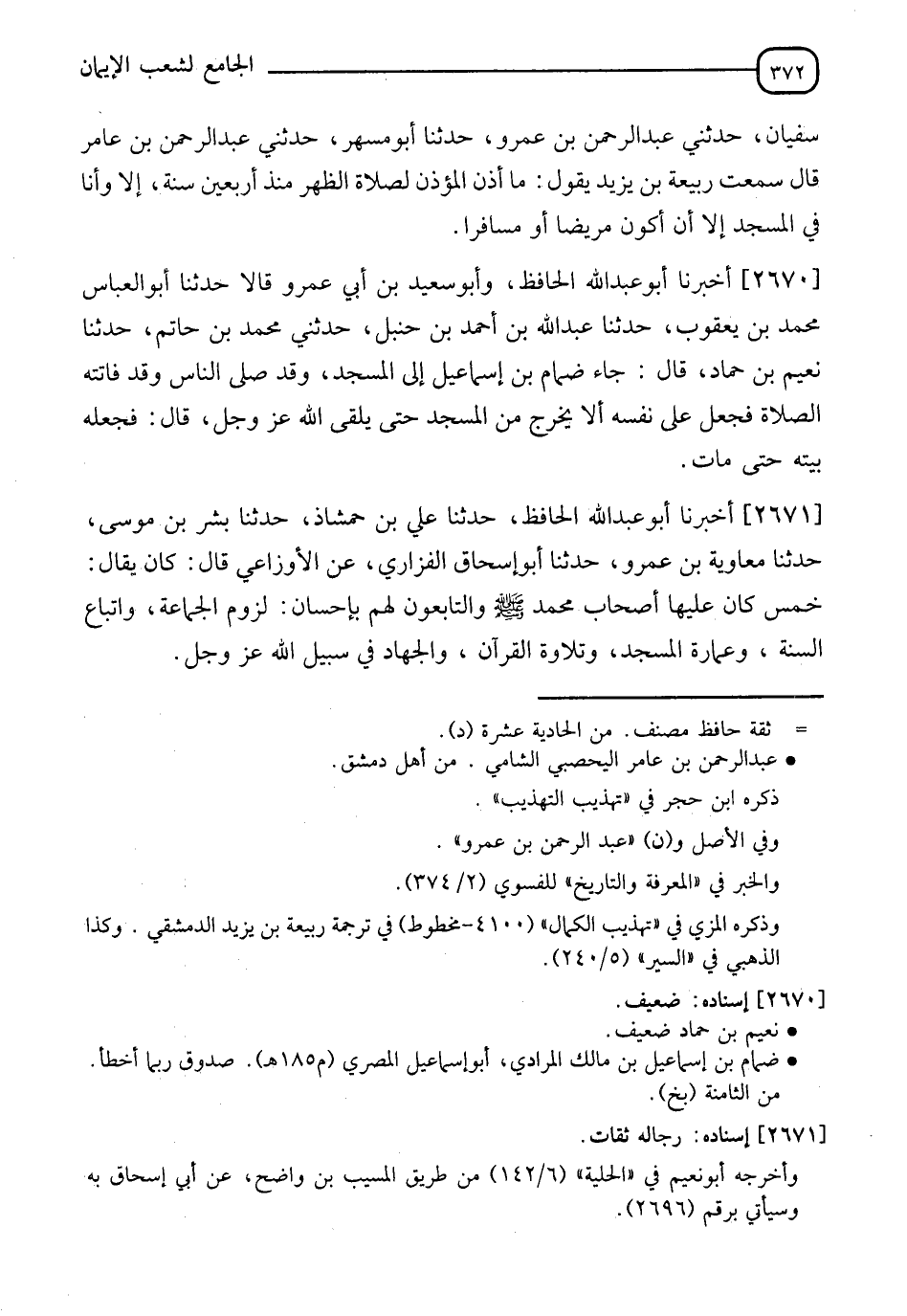 2670 - أَخْبَرَنَا أَبُو عَبْدِ اللهِ الْحَافِظُ، وَأَبُو سَعِيدِ بْنُ أَبِي عَمْرٍو، قَالَا: حَدَّثَنَا أَبُو الْعَبَّاسِ مُحَمَّدُ بْنُ يَعْقُوبَ، حَدَّثَنَا عَبْدُ اللهِ بْنُ أَحْمَدَ بْنِ حَنْبَلٍ، حَدَّثَنِي مُحَمَّدُ بْنُ حَاتِمٍ، حَدَّثَنَا نُعَيْمُ بْنُ حَمَّادٍ، قَالَ: " جَاءَ ضِمَامُ بْنُ إِسْمَاعِيلَ إِلَى الْمَسْجِدِ وَقَدْ §صَلَّى النَّاسُ وَقَدْ فَاتَتْهُ الصَّلَاةُ فَجَعَلَ عَلَى نَفْسِهِ أَلَّا يَخْرُجَ مِنَ الْمَسْجِدِ حَتَّى يَلْقَى اللهَ عَزَّ وَجَلَّ " قَالَ: " فَجَعَلَهُ بَيْتَهُ حَتَّى مَاتَ "