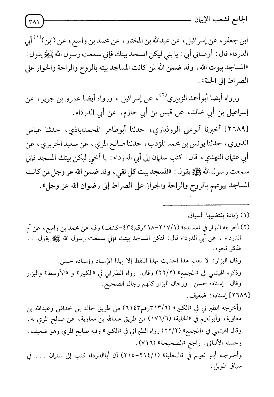 2689 - أَخْبَرَنَا أَبُو عَلِيٍّ الرُّوذْبَارِيُّ، حَدَّثَنَا أَبُو طَاهِرٍ الْمُحَمَّدْآبَاذِيُّ، حَدَّثَنَا عَبَّاسٌ الدُّورِيُّ، حَدَّثَنَا يُونُسُ بْنُ مُحَمَّدٍ الْمُؤَدِّبُ، حَدَّثَنَا صَالِحٌ الْمُرِيُّ، عَنْ سَعِيدٍ الْجُرَيْرِيِّ، عَنْ أَبِي عُثْمَانَ النَّهْدِيِّ، قَالَ: كَتَبَ سَلْمَانُ إِلَى أَبِي الدَّرْدَاءِ، يَا أَخِي لِيَكُنْ بَيْتُكَ الْمَسْجِدَ فَإِنِّي سَمِعْتُ رَسُولَ اللهِ صَلَّى اللَّهُ عَلَيْهِ وَسَلَّمَ يَقُولُ: §" الْمَسْجِدُ بَيْتُ كُلِّ تَقِيٍّ وَقَدْ ضَمِنَ اللهُ عَزَّ وَجَلَّ لِمَنْ كَانَت الْمَسْاجِدُ بَيْوتَهُم بالرَّوْحِ، وَالرَّاحَةِ، وَالْجَوَازِ عَلَى الصِّرَاطِ إِلَى رِضْوَانِ اللهِ عَزَّ وَجَلَّ "
