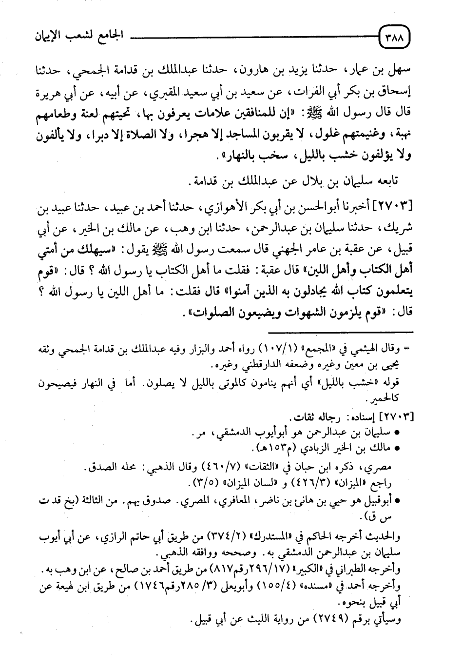 2703 - أَخْبَرَنَا أَبُو الْحَسَنِ بْنُ أَبِي بَكْرٍ الْأَهْوَازِيُّ، حَدَّثَنَا أَحْمَدُ بْنُ عُبَيْدٍ، حَدَّثَنَا عُبَيْدُ بْنُ شَرِيكٍ، حَدَّثَنَا سُلَيْمَانُ بْنُ عَبْدِ الرَّحْمَنِ، حَدَّثَنَا ابْنُ وَهْبٍ، عَنْ مَالِكِ بْنِ الخَيْرِ، عَنْ أَبِي قَبِيلٍ، عَنْ عُقْبَةَ بْنِ عَامِرٍ الْجُهَنِيِّ، قَالَ: سَمِعْتُ رَسُولَ اللهِ صَلَّى اللَّهُ عَلَيْهِ وَسَلَّمَ يَقُولُ: " §سَيَهْلَكُ مِنْ أُمَّتِي أَهْلُ الْكِتَابِ، وَأَهْلُ اللِّينِ " قَالَ عُقْبَةُ: فَقُلْتُ مَا أَهْلُ الْكِتَابِ يَا رَسُولَ اللهِ؟ قَالَ: " قَوْمٌ يَتَعَلَّمُونَ كِتَابَ اللهِ، يُجَادِلُونَ بِهِ الَّذِينَ آمَنُوا "، قَالَ: فَقُلْتُ: مَا أَهْلُ اللِّينِ يَا رَسُولَ اللهِ؟ قَالَ: " قَوْمٌ يَلْزَمُونَ الشَّهَوَاتِ، وَيُضَيِّعُونَ الصَّلَوَاتِ "