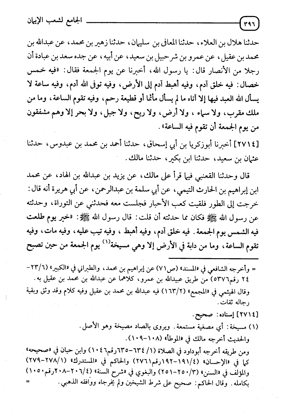 2714 - أَخْبَرَنَا أَبُو زَكَرِيَّا بْنُ أَبِي إِسْحَاقَ، حَدَّثَنَا أَحْمَدُ بْنُ مُحَمَّدِ بْنِ عَبْدُوسٍ، حَدَّثَنَا عُثْمَانُ بْنُ سَعِيدٍ، حَدَّثَنَا ابْنُ بُكَيْرٍ، حَدَّثَنَا مَالِكٌ، قَالَ: وَحَدَّثَنَا الْقَعْنَبِيُّ، فِيمَا قَرَأَ عَلَى مَالِكٍ، عَنْ يَزِيدَ بْنِ عَبْدِ اللهِ بْنِ الْهَادِ، عَنْ مُحَمَّدِ بْنِ إِبْرَاهِيمَ بْنِ الْحَارِثِ التَّيْمِيِّ، عَنْ أَبِي سَلَمَةَ بْنِ عَبْدِ الرَّحْمَنِ، عَنْ أَبِي هُرَيْرَةَ، أَنَّهُ قَالَ: خَرَجْتُ إِلَى الطُّورِ فَلَقِيتُ كَعْبَ الْأَحْبَارِ فَجَلَسْتُ مَعَهُ فَحَدَّثَنِي عَنِ التَّوْرَاةِ وَحَدَّثْتُهُ عَنْ رَسُولِ اللهِ صَلَّى اللَّهُ عَلَيْهِ وَسَلَّمَ فَكَانَ مِمَّا حَدَّثْتُهُ أَنْ قُلْتُ: قَالَ رَسُولُ اللهِ صَلَّى اللَّهُ عَلَيْهِ وَسَلَّمَ: " §خَيْرُ يَوْمٍ طَلَعَتْ فِيهِ الشَّمْسُ يَوْمُ الْجُمُعَةِ، فِيهِ خُلِقَ آدَمُ، وَفِيهِ أُهْبِطَ، وَفِيهِ تِيبَ عَلَيْهِ، وَفِيهِ مَاتَ، وَفِيهِ تَقُومُ السَّاعَةُ، وَمَا مِنْ دَابَّةٍ فِي الْأَرْضِ إِلَّا وَهِيَ مُسِيخَةٌ يَوْمَ الْجُمُعَةِ مِنْ حِينِ تُصْبِحُ -[397]- حَتَّى تَطْلُعَ الشَّمْسُ شَفَقًا مِنَ السَّاعَةِ إِلَّا الْجِنَّ وَالْإِنْسَ، وَفِيهِ سَاعَةٌ لَا يُوَافِقُهَا عَبْدٌ مُسْلِمٌ وَهُوَ يُصَلِّي يَسْأَلُ اللهَ فِيهَا شَيْئًا إِلَّا أَعْطَاهُ اللهُ إِيَّاهُ " فَقَالَ كَعْبٌ ذَلِكَ فِي كُلِّ سَنَةٍ يَوْمٌ فقُلْتُ: " بَلَى فِي كُلِّ جُمُعَةٍ " قَالَ: فَقَرَأَ كَعْبُ الْأَحْبَارِ التَّوْرَاةَ، فَقَالَ: صَدَقَ رَسُولُ اللهِ صَلَّى اللَّهُ عَلَيْهِ وَسَلَّمَ. فقَالَ أَبُو هُرَيْرَةَ: فَلَقِيتُ بَصْرَةَ بْنَ أَبِي بَصْرَةَ الْغِفَارِيَّ، قَالَ: مِنْ أَيْنَ أَقْبَلْتَ: فَقُلْتُ مِنَ الطُّورِ، فَقَالَ: لَوْ أَدْرَكَتُكَ قَبْلَ أَنْ تَخْرُجَ إِلَيْهِ مَا خَرَجْتَ. سَمِعْتُ رَسُولَ اللهِ صَلَّى اللَّهُ عَلَيْهِ وَسَلَّمَ يَقُولُ: " لَا يُعْمَلُ الْمَطِيُّ إِلَّا إِلَى ثَلَاثَةِ مَسَاجِدَ: الْمَسْجِدِ الْحَرَامِ وإِلَى مَسْجِدِي هَذَا، وإِلَى مَسْجِدِ إِيلِيَاءَ أَوْ بَيْتِ الْمَقْدِسِ - شَكَّ أَيُّهُمَا - "