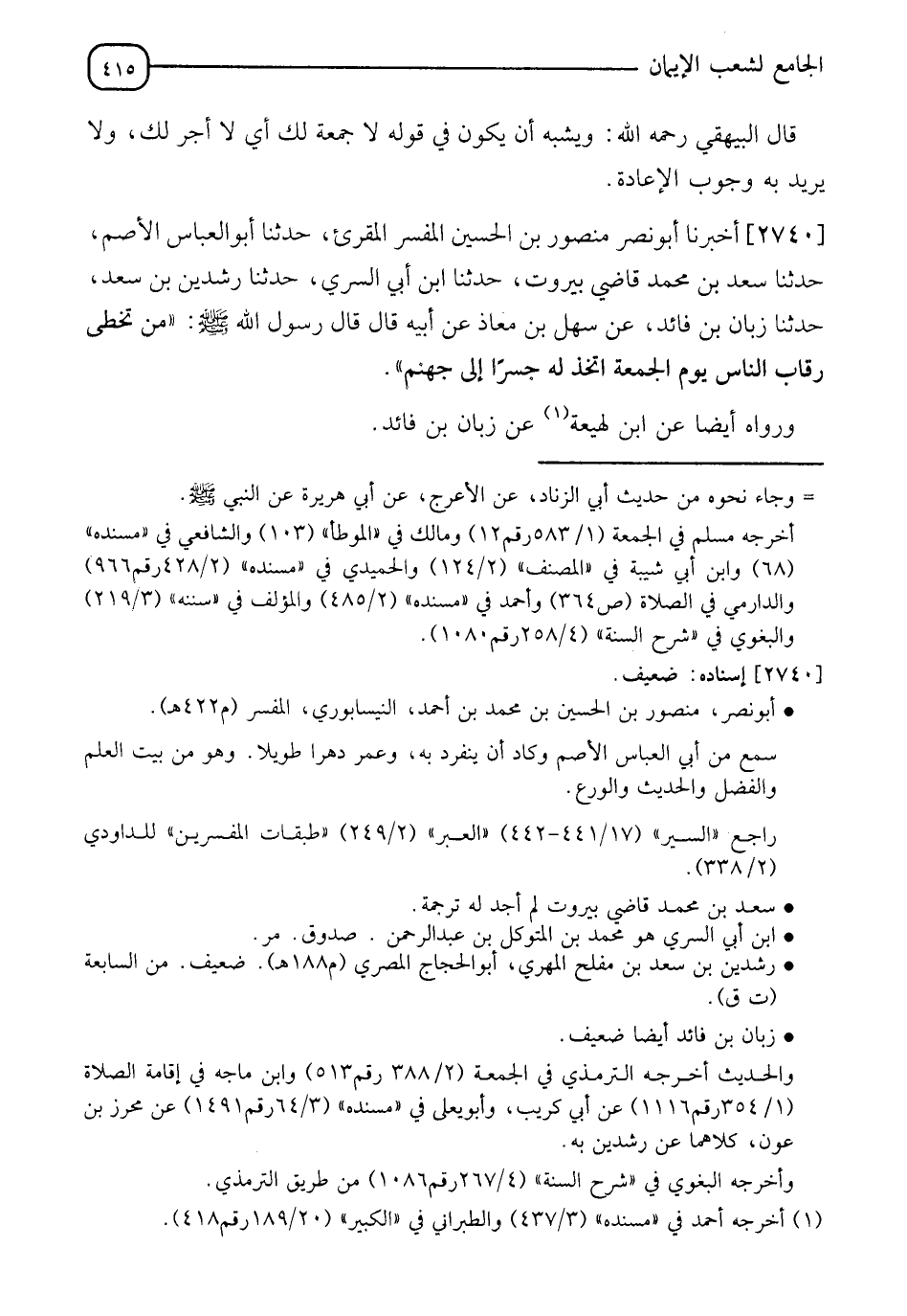 2740 - أَخْبَرَنَا أَبُو نَصْرٍ مَنْصُورُ بْنُ الْحُسَيْنِ الْمُفَسِّرُ الْمقرِئ، حَدَّثَنَا أَبُو الْعَبَّاسِ الْأَصَمُّ، حَدَّثَنَا سَعْدُ بْنُ مُحَمَّدٍ، قَاضِي بَيْرُوتَ، حَدَّثَنَا ابْنُ أَبِي السَّرِيِّ، حَدَّثَنَا رِشْدِينُ بْنُ سَعْدٍ، حَدَّثَنَا زَبَّانُ بْنُ فَائِدٍ، عَنْ سَهْلِ بْنِ مُعَاذٍ، عَنْ أَبِيهِ، قَالَ: قَالَ رَسُولُ اللهِ صَلَّى اللَّهُ عَلَيْهِ وَسَلَّمَ: §" مَنْ تَخَطَّى رِقَابَ النَّاسِ يَوْمَ الْجُمُعَةِ اتَّخَذَ لَهُ جِسْرًا إِلَى جَهَنَّمَ " وَرَوَاهُ أَيْضًا، عَنِ ابْنِ لَهِيعَةَ، عَنْ زَبَّانَ بْنِ فَائِدٍ
