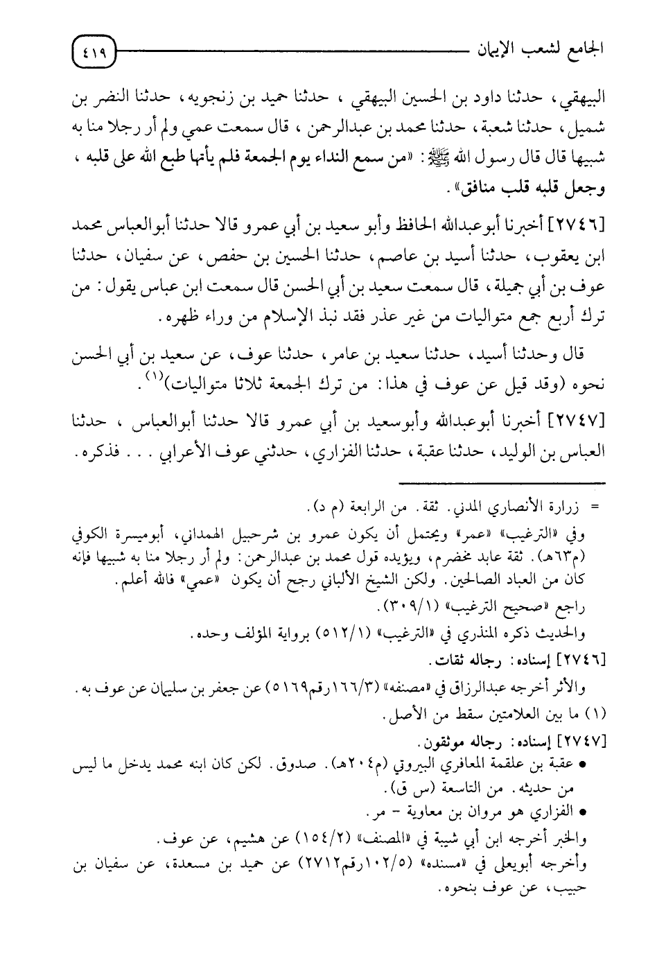 2746 - أَخْبَرَنَا أَبُو عَبْدِ اللهِ الْحَافِظُ، وَأَبُو سَعِيدِ بْنُ أَبِي عَمْرٍو، قَالَا: حَدَّثَنَا أَبُو الْعَبَّاسِ مُحَمَّدُ بْنُ يَعْقُوبَ، حَدَّثَنَا أُسَيْدُ بْنُ عَاصِمٍ، حَدَّثَنَا الْحُسَيْنُ بْنُ حَفْصٍ، عَنْ سُفْيَانَ، حَدَّثَنَا عَوْفُ بْنُ أَبِي جَمِيلَةَ، قَالَ: سَمِعْتُ سَعِيدَ بْنَ أَبِي الْحَسَنِ، قَالَ: سَمِعْتُ ابْنَ عَبَّاسٍ، يَقُولُ: §" مَنْ تَرَكَ أَرْبَعَ جُمَعٍ مُتَوَالِيَاتٍ مِنْ غَيْرِ عُذْرٍ فَقَدَ نَبَذَ الْإِسْلَامَ من وَرَاءِ ظَهْرِهِ " قَالَ: وَحَدَّثَنَا أَسيدٌ، حدثنا سَعِيدُ بْنُ عَامِرٍ، حَدَّثَنَا عَوْفٌ، عَنْ سَعِيدِ بْنِ أَبِي الْحَسَنِ نَحْوَهُ، وَقَدْ قِيلَ عَنْ عَوْفٍ " في هَذَا مَنْ تَرَكَ الْجُمُعَةَ ثَلَاثًا مُتَوَالِيَاتٍ "
