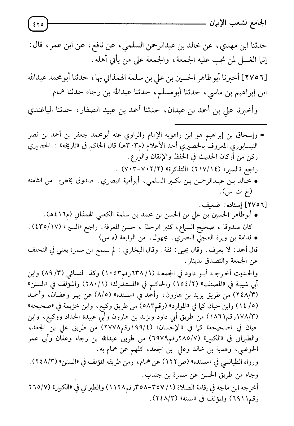 2756 - أَخْبَرَنَا أَبُو طَاهِرٍ الْحُسَيْنُ بْنُ عَلِيِّ بْنِ سَلَمَةَ الْهَمْذَانِيُّ، بِهَا، حَدَّثَنَا أَبُو مُحَمَّدٍ عَبْدُ اللهِ بْنُ إِبْرَاهِيمَ بْنِ ماسِيٍّ، حَدَّثَنَا أَبُو مسَلَمَ، حَدَّثَنَا عَبْدُ اللهِ بْنُ رَجَاءٍ، حَدَّثَنَا هَمَّامٌ، وَأَخْبَرَنَا عَلِيُّ بْنُ أَحْمَدَ بْنِ عَبْدَانَ، حَدَّثَنَا أَحْمَدُ بْنُ عُبَيْدٍ الصَّفَّارُ، حَدَّثَنَا الْبَاغَنْدِيُّ -[426]- مُحَمَّدُ بْنُ سُلَيْمَانَ، حَدَّثَنَا مُسْلِمُ بْنُ إِبْرَاهِيمَ الْأَزْدِيُّ، حَدَّثَنَا هَمَّامٌ، عَنْ قَتَادَةَ، عَنْ قُدَامَةَ بْنِ وَبَرَةَ، عَنْ سَمُرَةَ بْنِ جُنْدُبٍ، عَنِ النَّبِيِّ صَلَّى اللَّهُ عَلَيْهِ وَسَلَّمَ قَالَ: §" مَنْ تَرَكَ الْجُمُعَةَ مِنْ غَيْرِ عُذْرٍ فَلْيَتَصَدَّقْ بِدِينَارٍ فَإِنْ لَمْ يَجِدْ فَبِنِصْفِ دِينَارٍ " وَأَخْبَرَنَا عَلِيُّ بْنُ أَحْمَدَ بْنِ عَبْدَانَ، حَدَّثَنَا أَحْمَدُ بْنُ عُبَيْدٍ، حَدَّثَنَا مُحَمَّدُ بْنُ غَالِبٍ، حَدَّثَنَا مُوسَى بْنُ دَاوُدَ الضَّبِّيُّ، حَدَّثَنَا هَمَّامُ بْنُ يَحْيَى، فَذَكَرَهُ بِإِسْنَادِهِ مِثْلَهُ