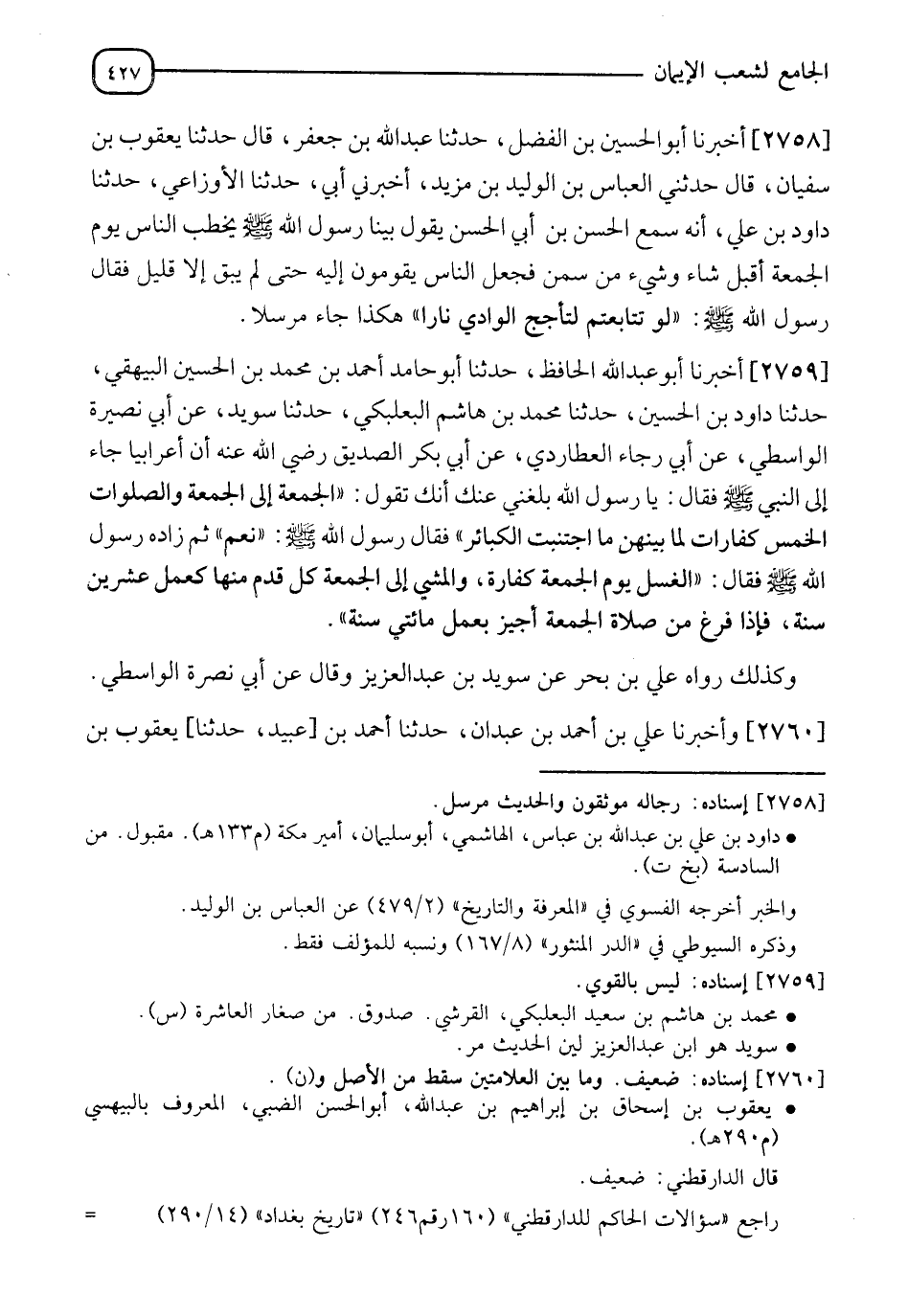 2759 - أَخْبَرَنَا أَبُو عَبْدِ اللهِ الْحَافِظُ، حَدَّثَنَا أَبُو حَامِدٍ أَحْمَدُ بْنُ مُحَمَّدِ بْنِ الْحُسَيْنِ الْبَيْهَقِيُّ، حَدَّثَنَا دَاوُدُ بْنُ الْحُسَيْنِ، حَدَّثَنَا مُحَمَّدُ بْنُ هَاشِمٍ الْبَعْلَبَكِّيُّ، حَدَّثَنَا سُوَيْدٌ، عَنْ أَبِي نُصَيْرَةَ الْوَاسِطِيِّ، عَنْ أَبِي رَجَاءٍ الْعُطَارِدِيِّ، عَنْ أَبِي بَكْرٍ الصِّدِّيقِ رَضِيَ اللهُ عَنْهُ، أَنَّ أَعْرَابِيًّا جَاءَ إِلَى النَّبِيِّ صَلَّى اللَّهُ عَلَيْهِ وَسَلَّمَ فَقَالَ: يَا رَسُولَ اللهِ، بَلَغَنِي عَنْكَ أَنَّكَ تَقُولُ: §" الْجُمُعَةُ إِلَى الْجُمُعَةِ وَالصَّلَوَاتُ الْخَمْسُ كَفَّارَاتٌ لِمَا بَيْنَهُنَّ مَا اجْتُنِبَتِ الْكَبَائِرُ " فَقَالَ رَسُولُ اللهِ صَلَّى اللَّهُ عَلَيْهِ وَسَلَّمَ: " نَعَمْ " ثُمَّ زَادَهُ رَسُولُ اللهِ صَلَّى اللَّهُ عَلَيْهِ وَسَلَّمَ فَقَالَ: " الْغُسْلُ يَوْمَ الْجُمُعَةِ كَفَّارَةٌ، وَالْمَشْيُ إِلَى الْجُمُعَةِ كُلُّ قَدَمٍ مِنْهَا كَعَمَلِ عِشْرِينَ سَنَةً، فَإِذَا فَرَغَ مِنْ صَلَاةِ الْجُمُعَةِ أُجِيزَ بِعَمَلِ مِائَتَيْ سَنَةً " وَكَذَلِكَ رَوَاهُ عَلِيُّ بْنُ بَحْرٍ، عَنْ سُوَيْدِ بْنِ عَبْدِ الْعَزِيزِ، وَقَالَ عَنْ أَبِي نَصرَةَ الْوَاسِطِيِّ