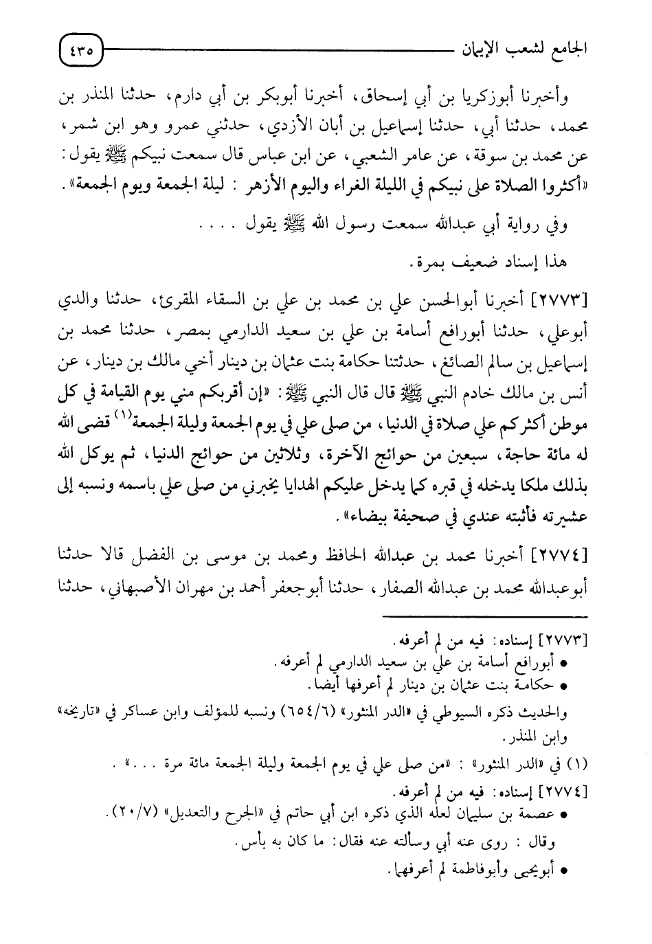 2773 - أَخْبَرَنَا أَبُو الْحَسَنِ عَلِيُّ بْنُ مُحَمَّدِ بْنِ عَلِيِّ بْنِ السِّقَاءِ الْمُقْرِئُ، حَدَّثَنَا وَالِدِي أَبُو عَلِيٍّ، حَدَّثَنَا أَبُو رَافِعٍ أُسَامَةُ بْنُ عَلِيِّ بْنِ سَعِيدٍ الدَّارِمِيُّ بِمِصْرَ، حَدَّثَنَا مُحَمَّدُ بْنُ إِسْمَاعِيلَ بْنِ سَالِمٍ الصَّائِغُ، حَدَّثَتْنَا حَكَامَةُ بِنْتُ عُثْمَانَ بْنِ دِينَارٍ، أَخِي مَالِكِ بْنِ دِينَارٍ، عَنْ أَنَسِ بْنِ مَالِكٍ، خَادِمِ النَّبِيِّ صَلَّى اللَّهُ عَلَيْهِ وَسَلَّمَ قَالَ: قَالَ النَّبِيُّ صَلَّى اللَّهُ عَلَيْهِ وَسَلَّمَ: " إِنَّ §أَقْرَبَكُمْ مِنِّي يَوْمَ الْقِيَامَةِ فِي كُلِّ مَوْطِنٍ أَكْثَرُكُمْ عَلَيَّ صَلَاةً فِي الدُّنْيَا مَنْ صَلَّى عَلَيَّ فِي يَوْمِ الْجُمُعَةِ وَلَيْلَةِ الْجُمُعَةِ، قَضَى اللهُ لَهُ مِائَةَ حَاجَةٍ، سَبْعِينَ مِنْ حَوَائِجِ الْآخِرَةِ، وَثَلَاثِينَ مِنْ حَوَائِجِ الدُّنْيَا، ثُمَّ يُوَكِّلُ اللهُ بِذَلِكَ مَلَكًا يُدْخِلُهُ فِي قَبْرِهِ كَمَا يُدْخِلُ عَلَيْكُمُ الْهَدَايَا، يُخْبِرُنِي مَنْ صَلَّى عَلَيَّ بِاسْمِهِ وَنَسَبِهِ إِلَى عَشِيرَتِهِ فَأُثْبِتُهُ عِنْدِي فِي صَحِيفَةٍ بَيْضَاءَ "