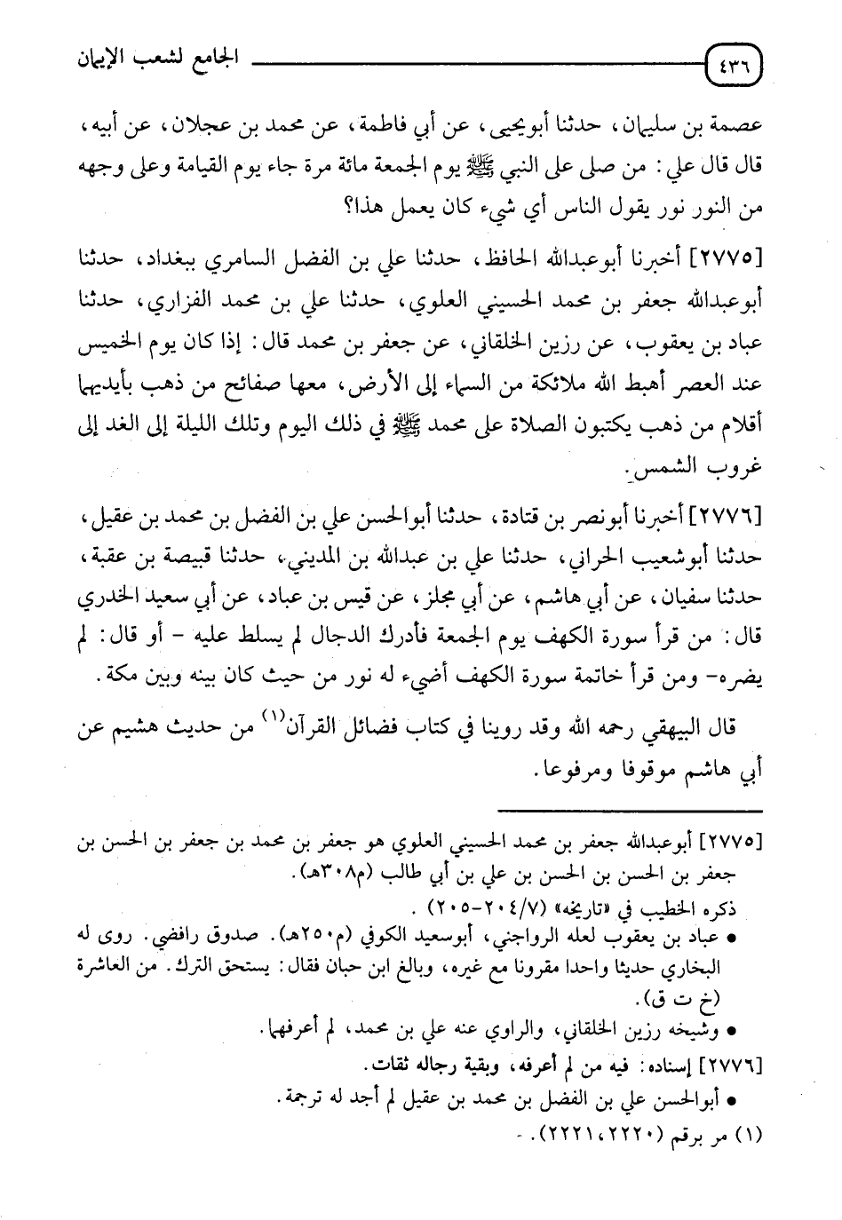 2776 - أَخْبَرَنَا أَبُو نَصْرِ بْنِ قَتَادَةَ، حَدَّثَنَا أَبُو الْحَسَنِ عَلِيُّ بْنُ الْفَضْلِ بْنِ مُحَمَّدِ بْنِ عُقَيْلٍ، حَدَّثَنَا أَبُو شُعَيْبٍ الْحَرَّانِيُّ، حَدَّثَنَا عَلِيُّ بْنُ عَبْدِ اللهِ بْنِ الْمَدِينِيِّ، حَدَّثَنَا قَبِيصَةُ بْنُ عُقْبَةَ، حَدَّثَنَا سُفْيَانُ، عَنْ أَبِي هَاشِمٍ، عَنْ أَبِي مِجْلَزٍ، عَنْ قَيْسِ بْنِ عَبَّادٍ، عَنْ أَبِي سَعِيدٍ الْخُدْرِيِّ، قَالَ: §" مَنْ قَرَأَ سُورَةَ الْكَهْفِ يَوْمَ الْجُمُعَةِ فَأَدْرَكَ الدَّجَّالَ لَمْ يُسَلَّطْ عَلَيْهِ، - أَوْ قَالَ: لَمْ يَضُرُّهُ - وَمَنْ قَرَأَ خَاتِمَةَ سُورَةِ الْكَهْفِ أَضَاءَ لَهُ نُورًا مِنْ حَيْثُ كَانَ بَيْنَهُ وَبَيْنَ مَكَّةَ " قَالَ الْبَيْهَقِيُّ رَحِمَهُ اللهُ: " وَقَدْ رُوِّينَا فِي كِتَابِ فَضَائِلِ الْقُرْآنِ مِنْ حَدِيثِ هُشَيْمٍ، عَنْ أَبِي هَاشِمٍ مَوْقُوفًا وَمَرْفُوعًا "