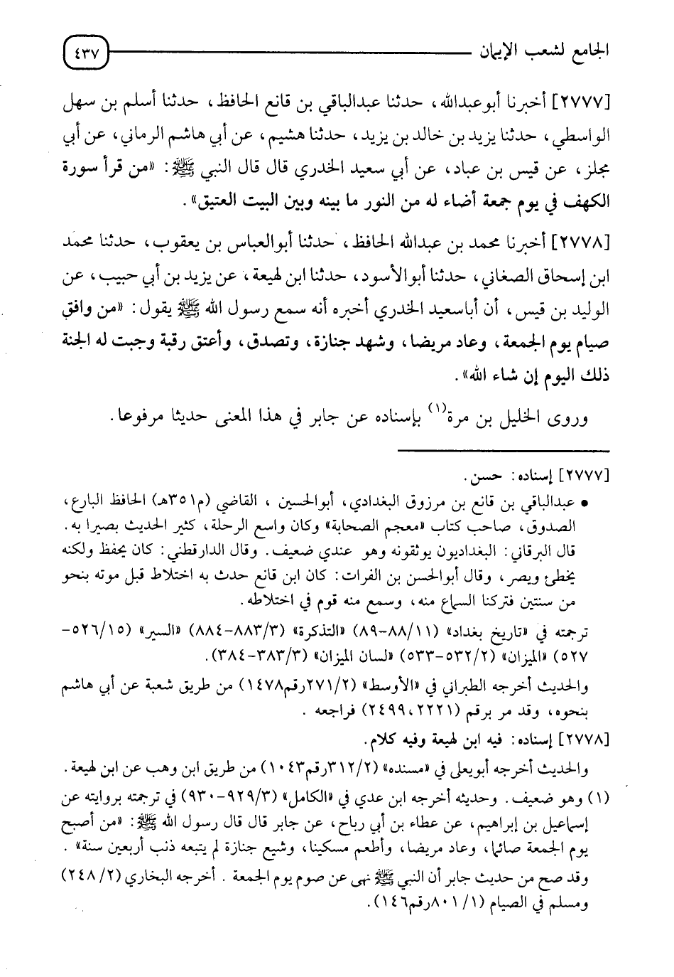 2777 - أَخْبَرَنَا أَبُو عَبْدِ اللهِ، حَدَّثَنَا عَبْدُ الْبَاقِي بْنُ قَانِعٍ الْحَافِظُ، حَدَّثَنَا أَسْلَمُ بْنُ سَهْلٍ الْوَاسِطِيُّ، حَدَّثَنَا يَزِيدُ بْنُ خَالِدِ بْنِ يَزِيدَ، حَدَّثَنَا هُشَيْمٌ، عَنْ أَبِي هَاشِمٍ الرُّمَّانِيِّ، عَنْ أَبِي مِجْلَزٍ، عَنْ قَيْسِ بْنِ عَبَّادٍ، عَنْ أَبِي سَعِيدٍ الْخُدْرِيِّ، قَالَ: قَالَ النَّبِيُّ صَلَّى اللَّهُ عَلَيْهِ وَسَلَّمَ: §" مَنْ قَرَأَ سُورَةَ الْكَهْفِ في يَوْمَ جُمُعَةٍ أَضَاءَ لَهُ مِنَ النُّورِ مَا بَيْنَهُ وَبَيْنَ الْبَيْتِ الْعَتِيقِ "