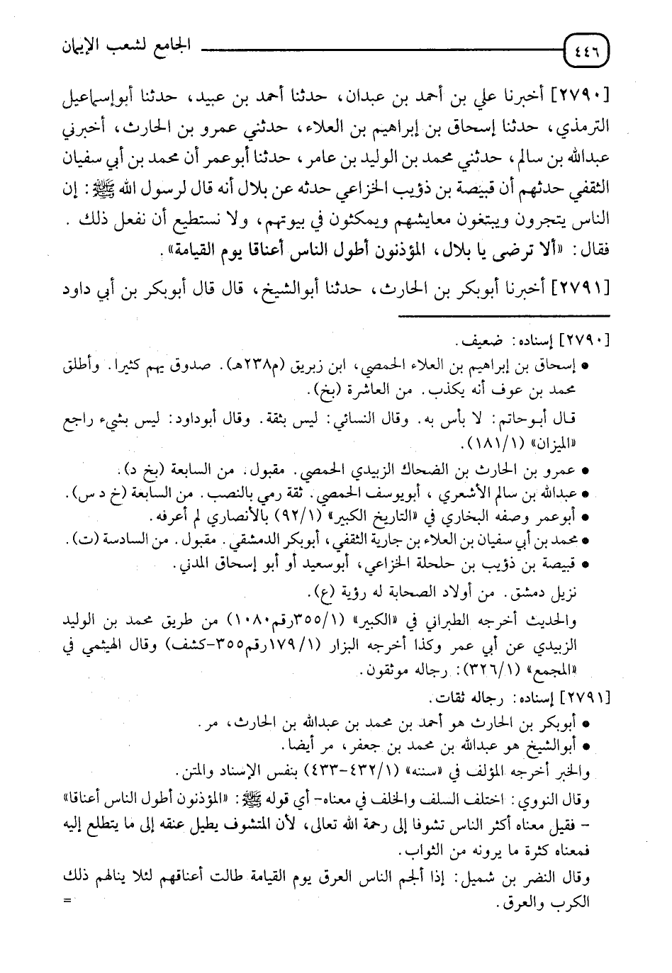 2790 - أَخْبَرَنَا عَلِيُّ بْنُ أَحْمَدَ بْنِ عَبْدَانَ، حَدَّثَنَا أَحْمَدُ بْنُ عُبَيْدٍ، حَدَّثَنَا أَبُو إِسْمَاعِيلَ التِّرْمِذِيُّ، حَدَّثَنَا إِسْحَاقُ بْنُ إِبْرَاهِيمَ بْنِ الْعَلَاءِ، حَدَّثَنِي عَمْرُو بْنُ الْحَارِثِ، أَخْبَرَنِي عَبْدُ اللهِ بْنُ سَالِمٍ، حَدَّثَنِي مُحَمَّدُ بْنُ الْوَلِيدِ بْنِ عَامِرٍ، حَدَّثَنَا أَبُو عمر أن مُحَمَّدُ بْنُ أَبِي سُفْيَانَ الثَّقَفِيُّ، حَدَّثَهُمْ أَنَّ قَبِيصَةَ بْنَ ذُؤَيْبٍ الْخُزَاعِيُّ حَدَّثَهُ، عَنْ بِلَالٍ، أَنَّهُ قَالَ لِرَسُولِ اللهِ صَلَّى اللَّهُ عَلَيْهِ وَسَلَّمَ: إِنَّ النَّاسَ يَتَّجِرُونَ وَيَبْتَغُونَ مَعَايِشَهُمْ، وَيَمْكُثُونَ فِي بُيُوتِهِمْ، وَلَا نَسْتَطِيعُ أَنْ نَفْعَلَ ذَلِكَ فَقَالَ: " أَلَا تَرْضَى يَا بِلَالُ §الْمُؤَذِّنُونَ أَطْوَلُ النَّاسِ أَعْنَاقًا يَوْمَ الْقِيَامَةِ "