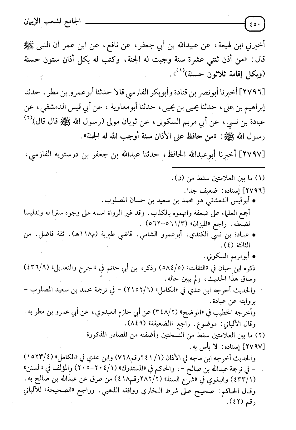 2797 - أَخْبَرَنَا أَبُو عَبْدِ اللهِ الْحَافِظُ، حَدَّثَنَا عَبْدُ اللهِ بْنُ جَعْفَرَ بْنُ دُرُسْتَوَيْهِ الْفَارِسِيُّ، -[451]- حَدَّثَنَا يَعْقُوبُ بْنُ سُفْيَانَ الْفَسوِي، حَدَّثَنَا أَبُو صَالِحٍ عَبْدُ اللهِ بْنُ صَالِحٍ، حَدَّثَنِي يَحْيَى بْنُ أَيُّوبَ، عَنِ ابْنِ جُرَيْجٍ، عَنْ نَافِعٍ، عَنِ ابْنِ عُمَرَ، أَنَّ النَّبِيَّ صَلَّى اللَّهُ عَلَيْهِ وَسَلَّمَ قَالَ: " §مَنْ أَذَّنَ ثِنْتَيْ عَشْرَةَ سَنَةً وَجَبَتْ لَهُ الْجَنَّةُ، وَكَتَبَ اللهُ لَهُ بِتَأْذِينِهِ كُلُّ مَرَّةٍ سِتِّينَ حَسَنَةً، وَبِكُلِّ إِقَامَةٍ ثَلَاثِينَ حَسَنَةً "